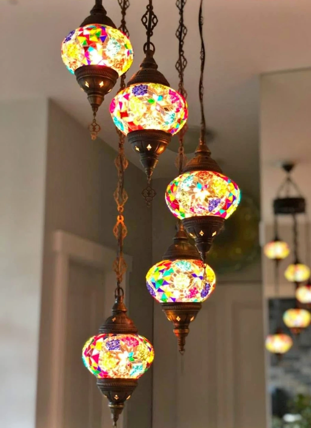 Add a vibrant touch to your space with this 5-light Turkish mosaic chandelier. Its colourful glass globes cast a beautiful glow. Perfect for creating a cozy ambiance in any room!