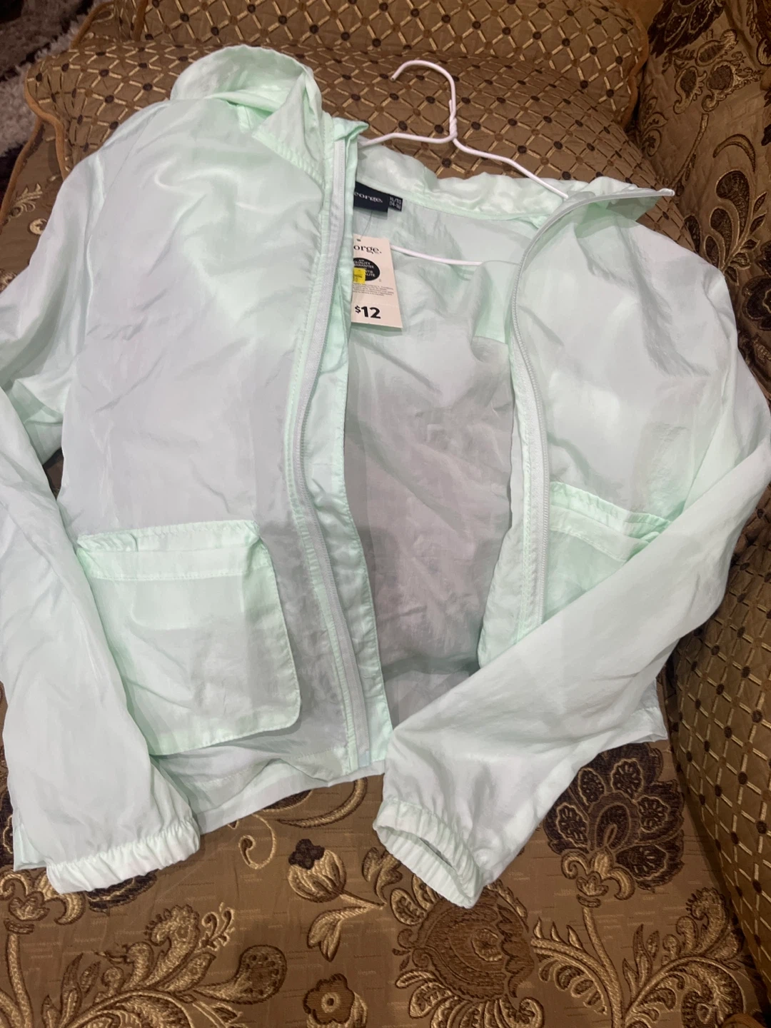 This is a light mint green windbreaker jacket by George. It's a size XL and features a full zipper front and two front pockets. It's made from a lightweight material perfect for everyday wear.