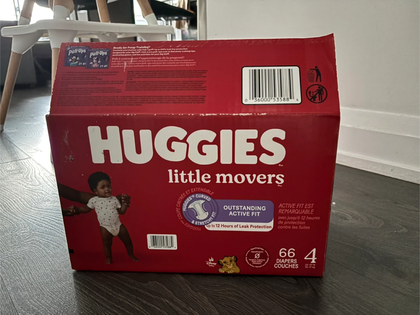 Selling a box of Huggies Little Movers diapers, size 4! The box contains 66 diapers, perfect for little ones weighing 22-37 lbs. These diapers feature outstanding active fit and up to 12 hours of leak protection, so your baby stays comfy and dry. Great for parents looking to stock up!