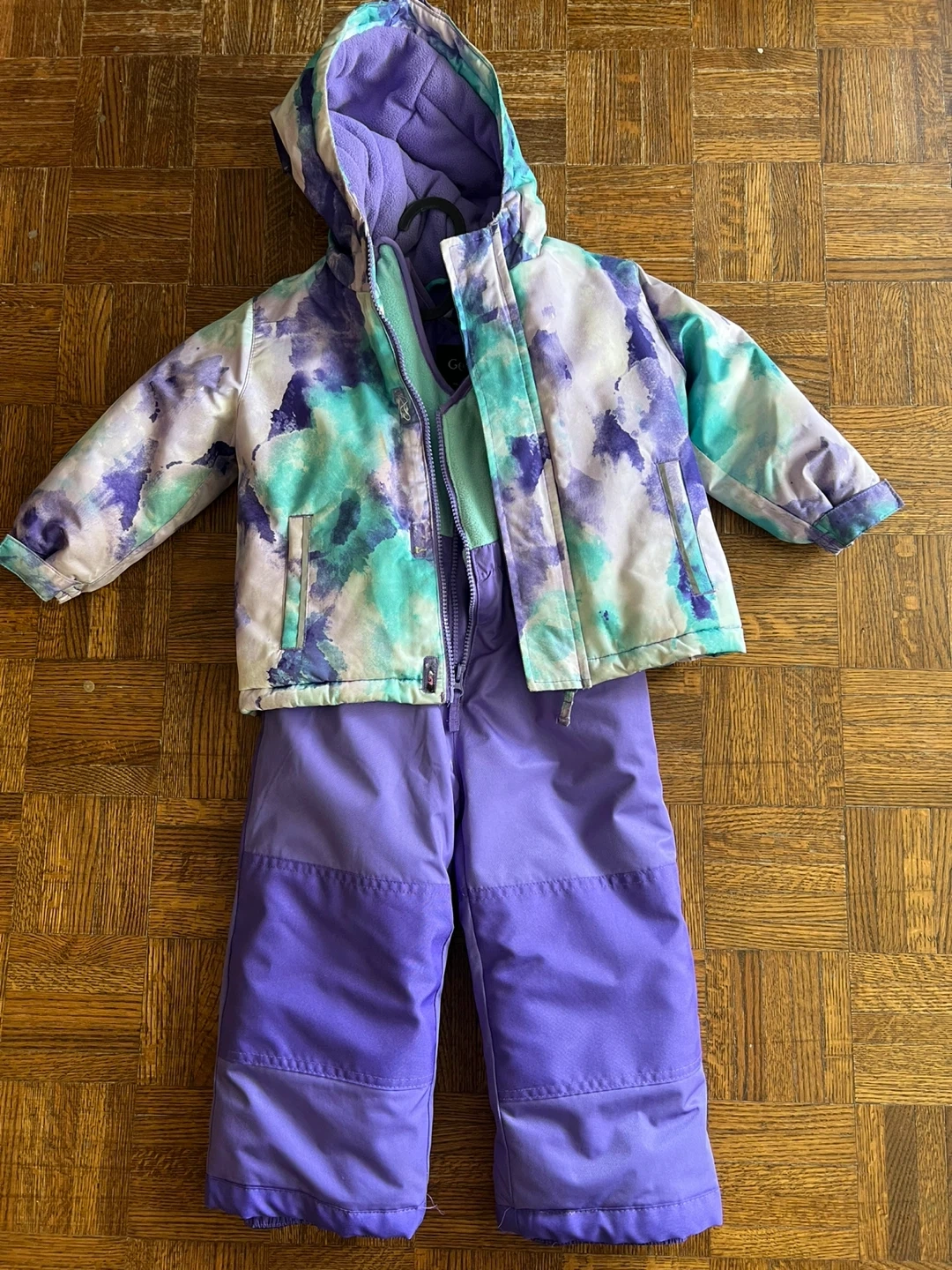 This girls' ski suit set is perfect for hitting the slopes! It features a colourful tie-dye pattern on the jacket in shades of purple, teal, and white, with matching purple snow pants. The jacket has a fleece-lined hood and interior, while the pants offer durable protection from the elements.
