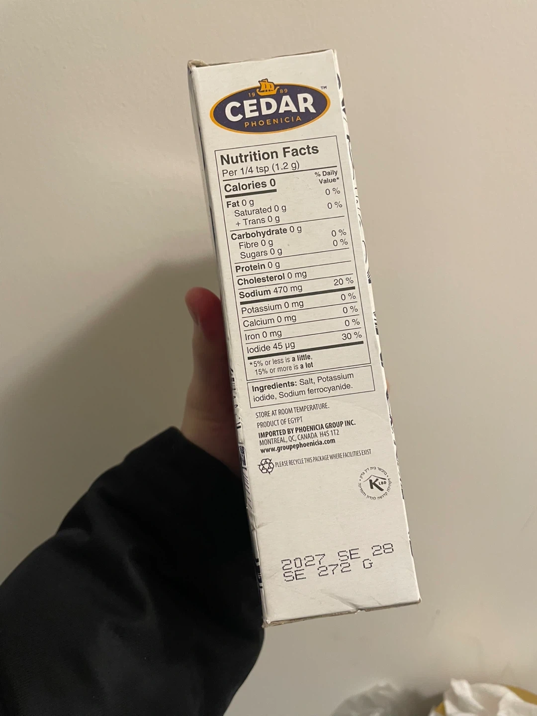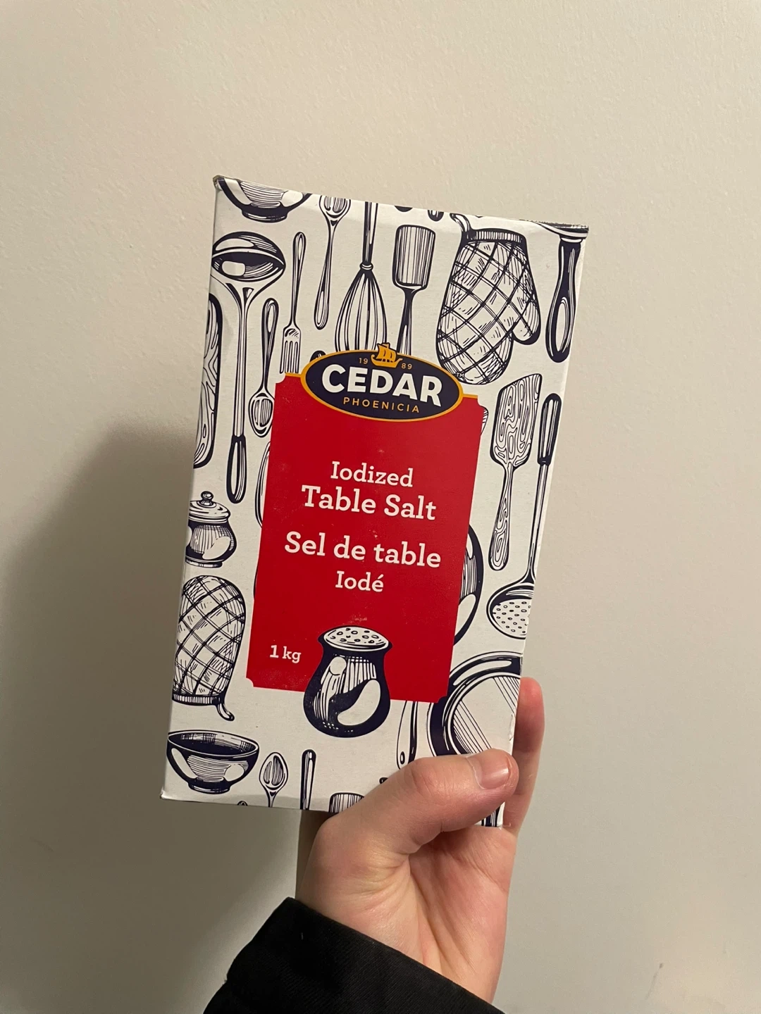 This is a 1kg box of Cedar Phoenicia Iodized Table Salt. It's made with salt and potassium iodide. Product of Quebec.
