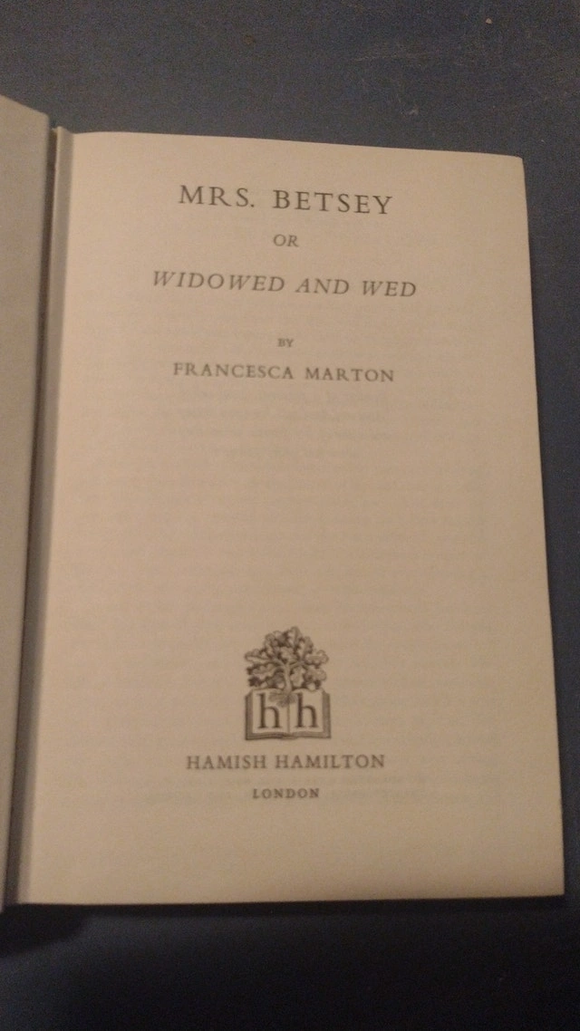 First edition hardcover book titled Mrs. Betsey: Or Widowed & Wed by Francesca Marton. Published by Hamish Hamilton, London, in 1954. Condition is Used - Good. For sale by owner. Curbside pickup available. Cash accepted.