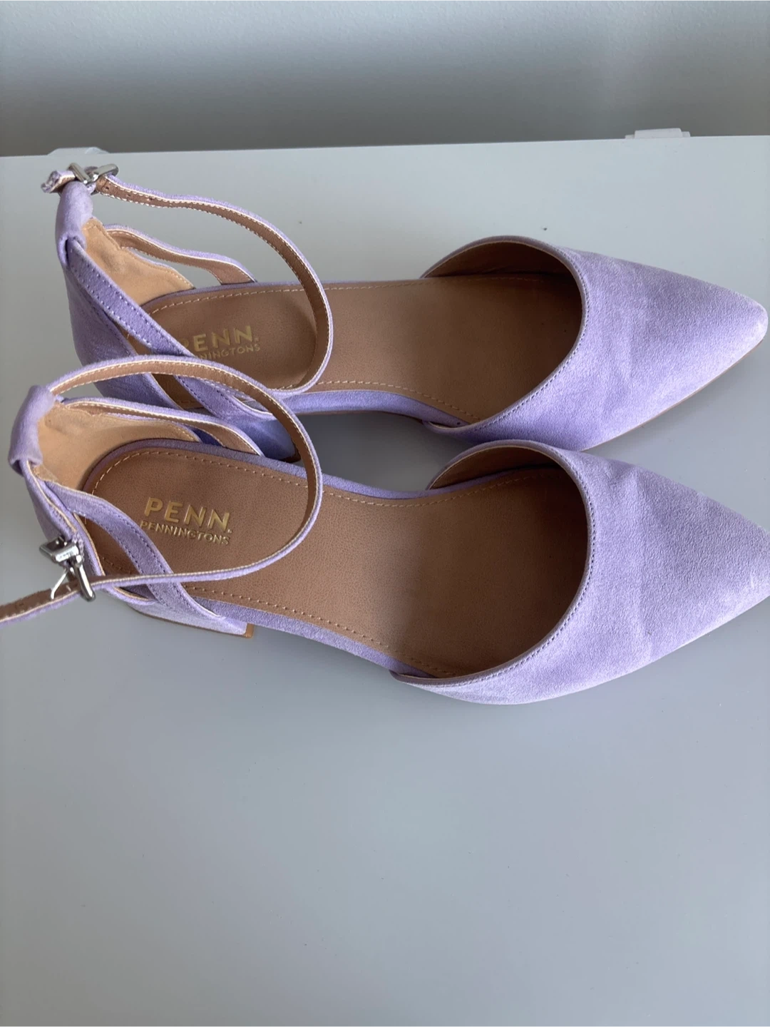 These Penningtons heels are a lovely lavender colour and feature a cute ankle strap. They are a women's size 9WW. Perfect for dressing up or adding a pop of colour to your outfit! Only worn once.