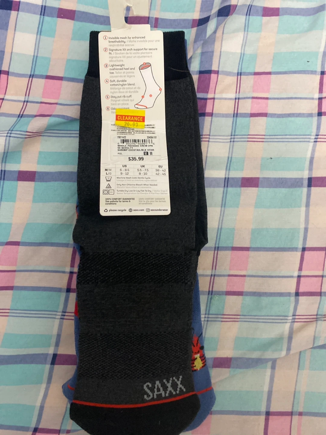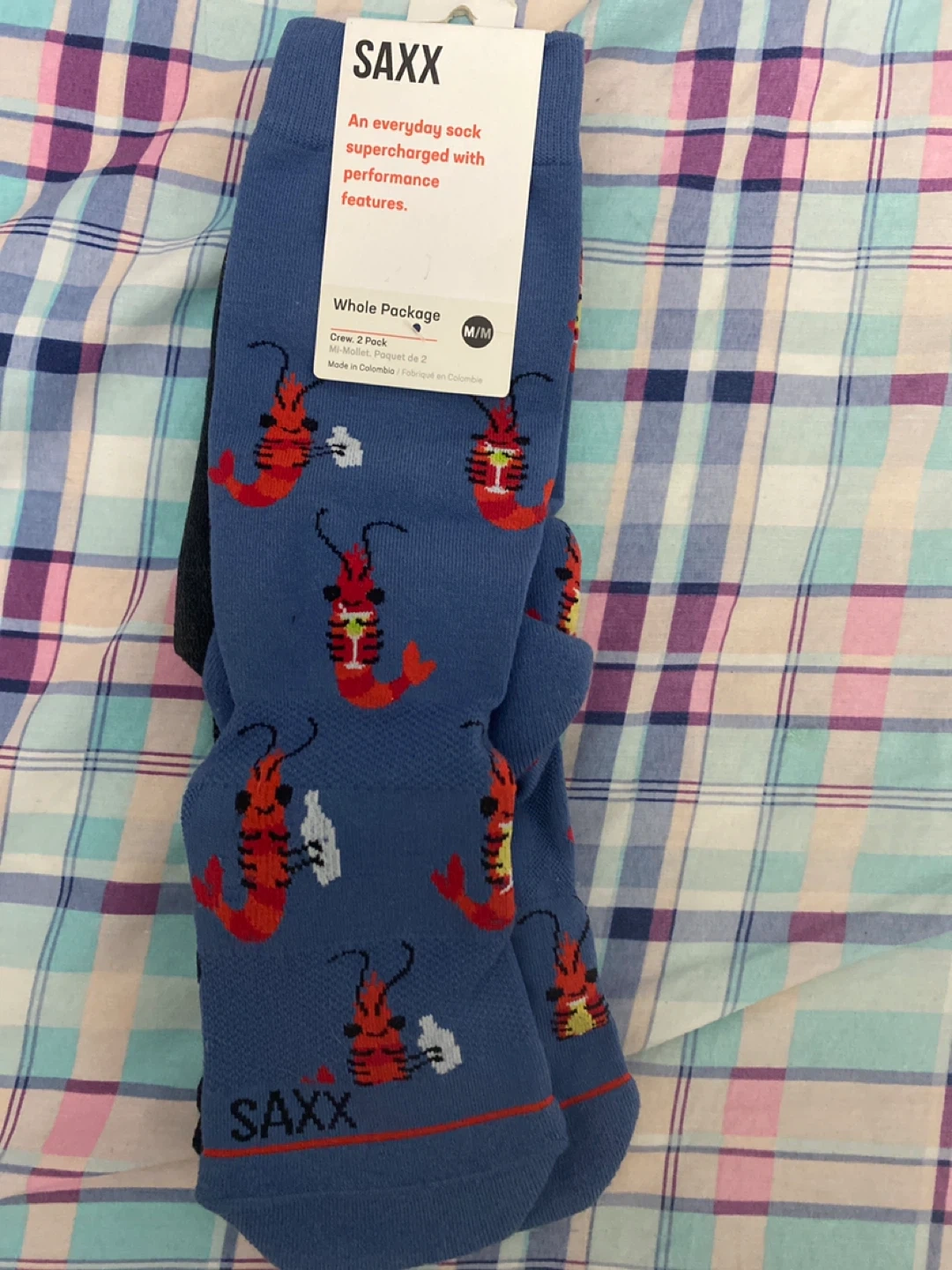 These SAXX crew socks are an everyday sock supercharged with performance features. They come in a pack of two and are size M/M. One pair is gray, and the other is blue with a fun lobster design. Originally priced at $35.99!