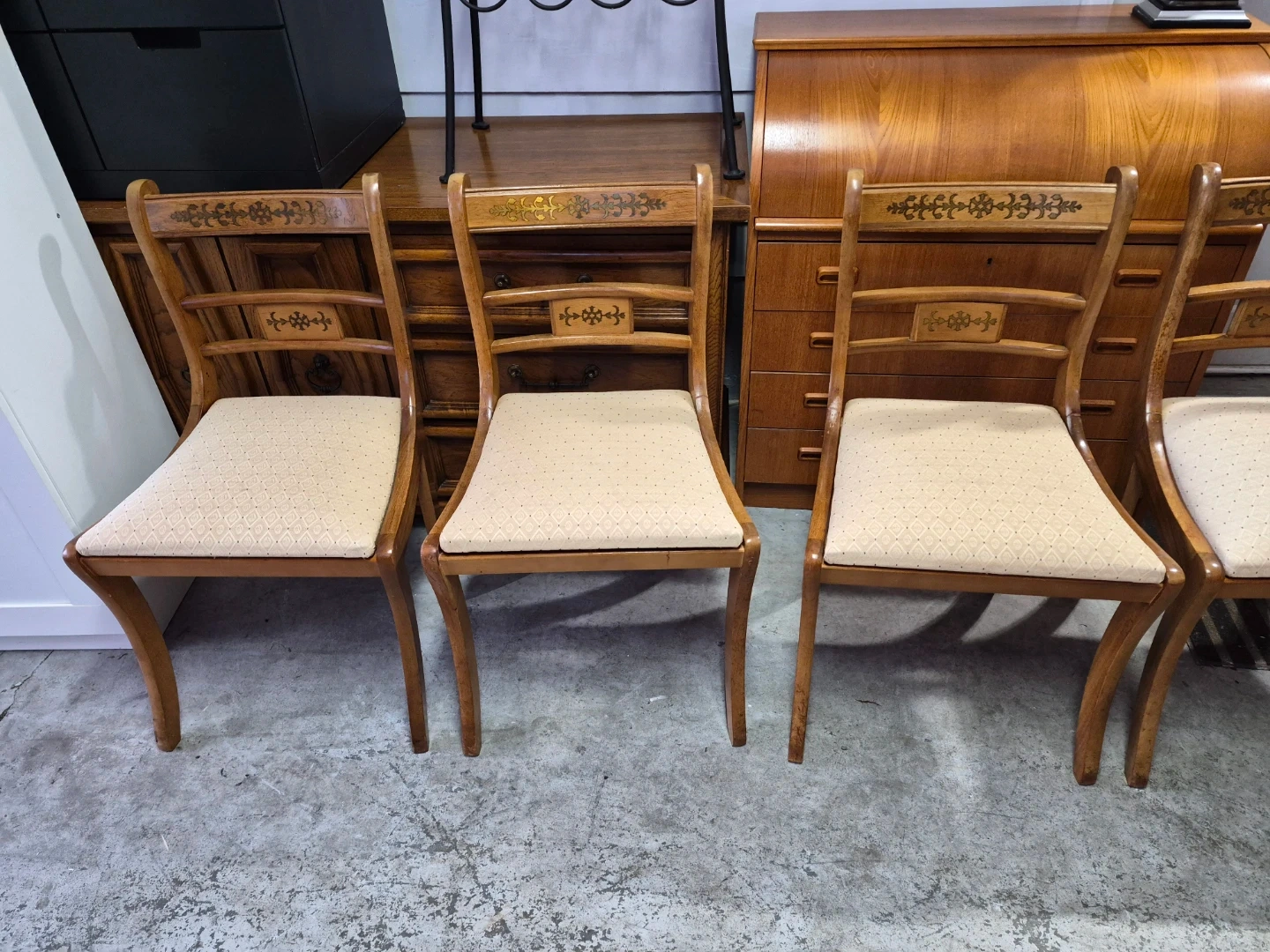 This set includes four wooden dining chairs featuring upholstered seats. The chairs have decorative inlays on the backrests and elegant curved legs. They appear to be made of a light-coloured wood with a natural finish. The upholstery is a neutral, patterned fabric.