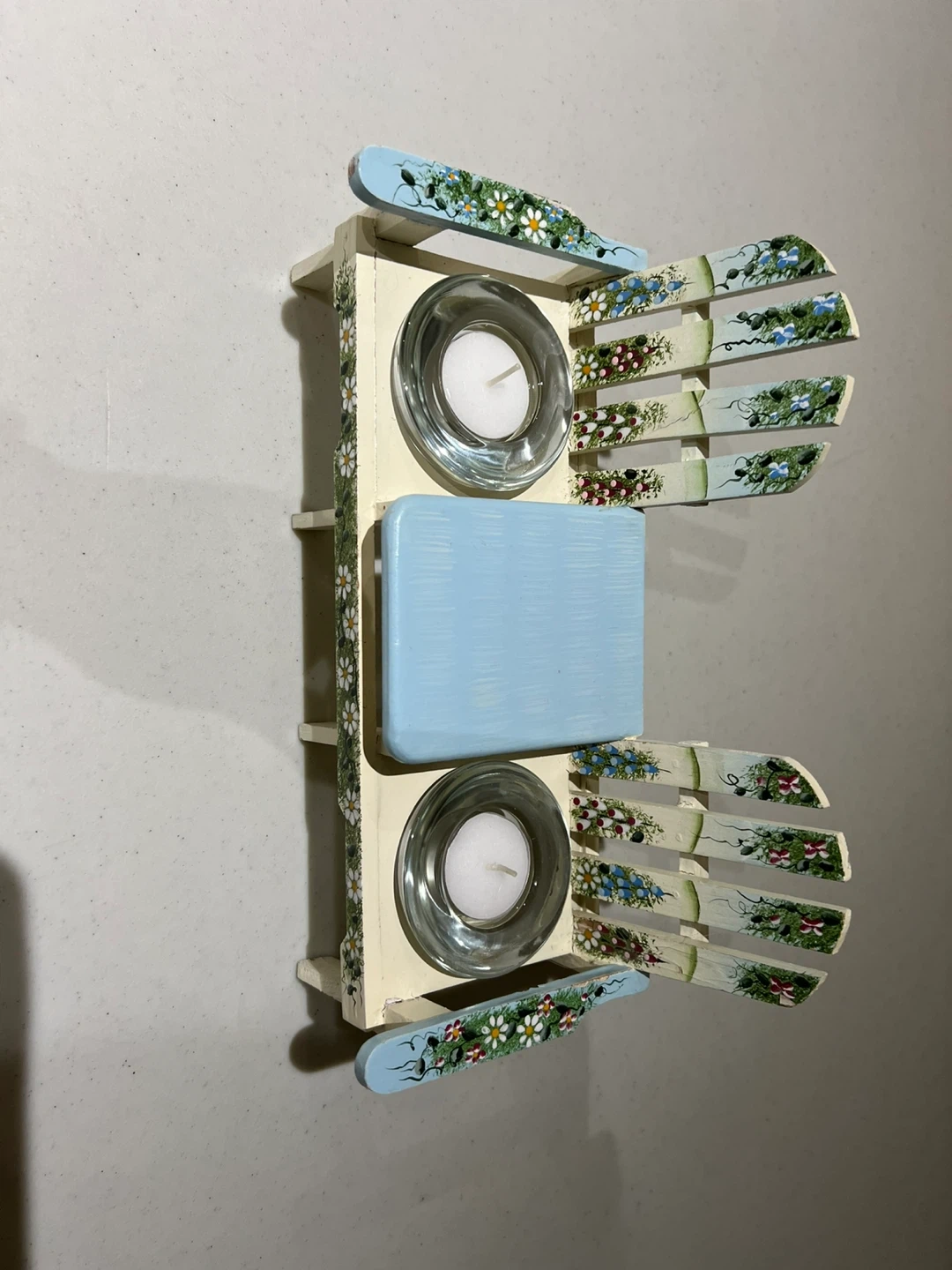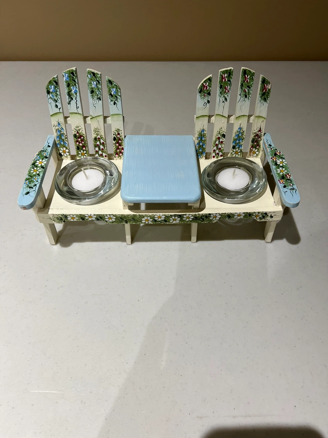 This charming candle holder is designed to look like a miniature Adirondack chair set with a small table in between. It includes two glass votive holders, perfect for adding a cozy ambiance. It's crafted from wood with a hand-painted floral design.