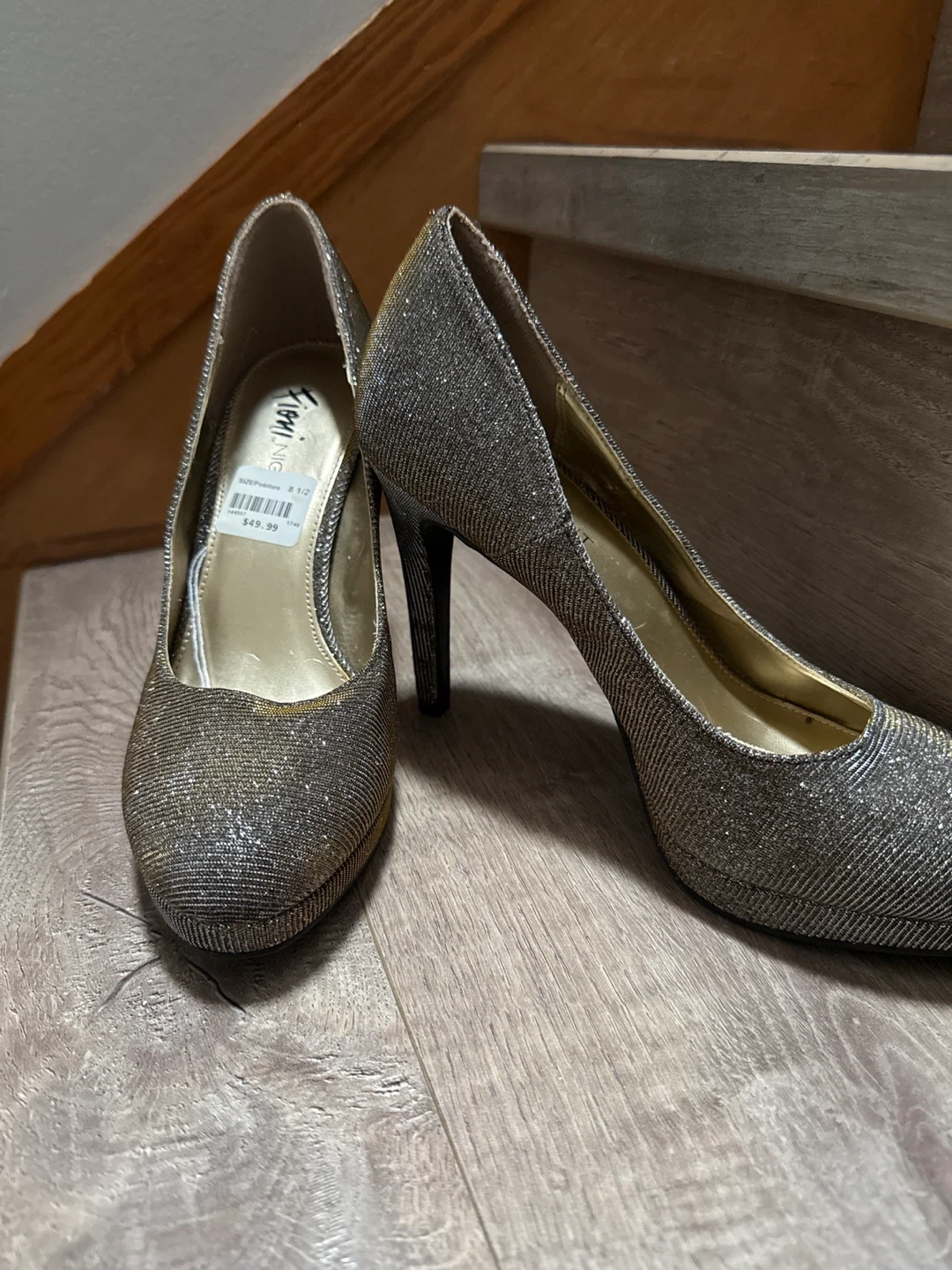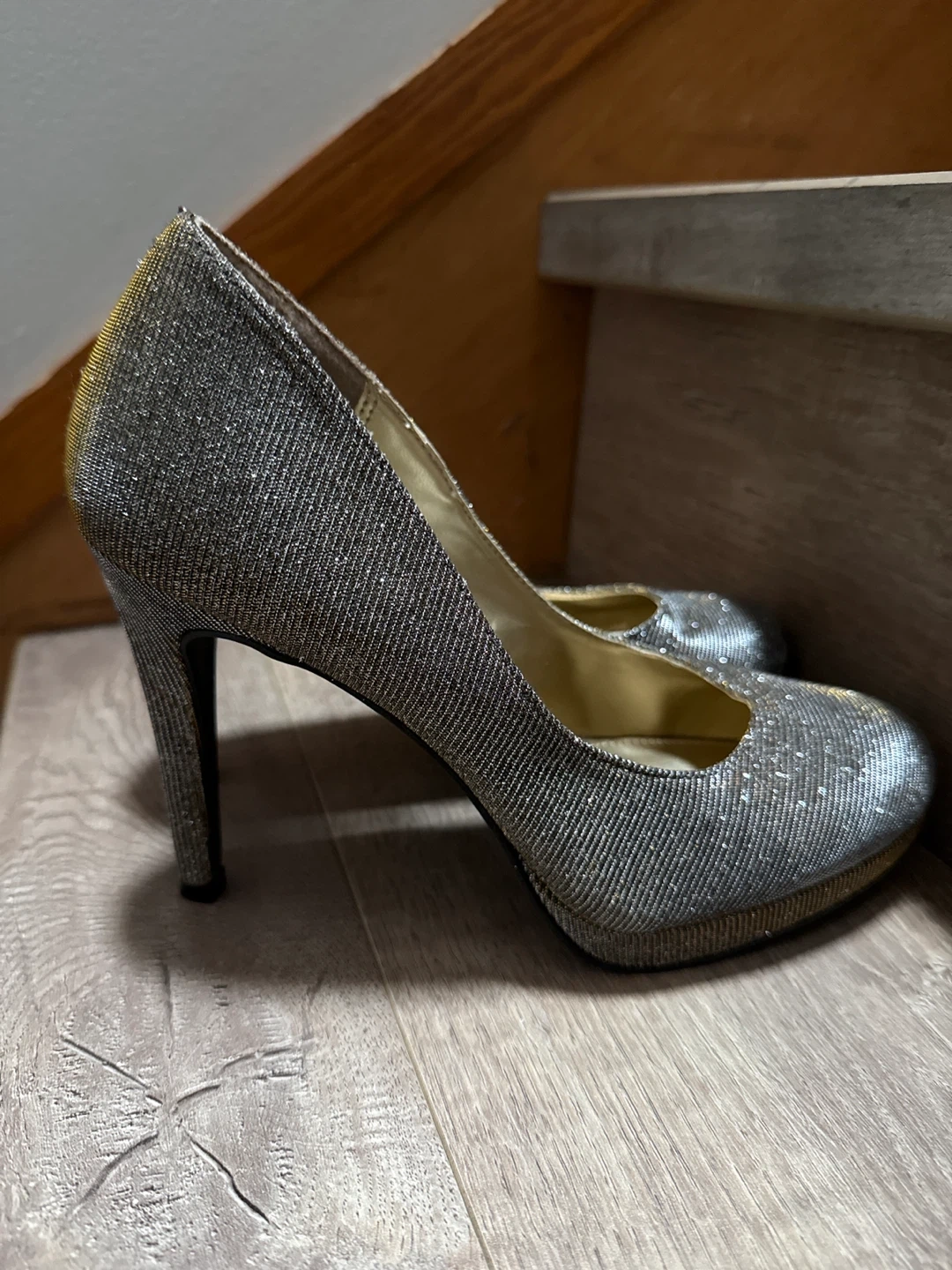 Sparkly silver glitter high heel pumps. These stylish heels feature a classic pump silhouette with a comfortable platform. They're perfect for adding a touch of glamour to any outfit, whether it's a night out or a special occasion!