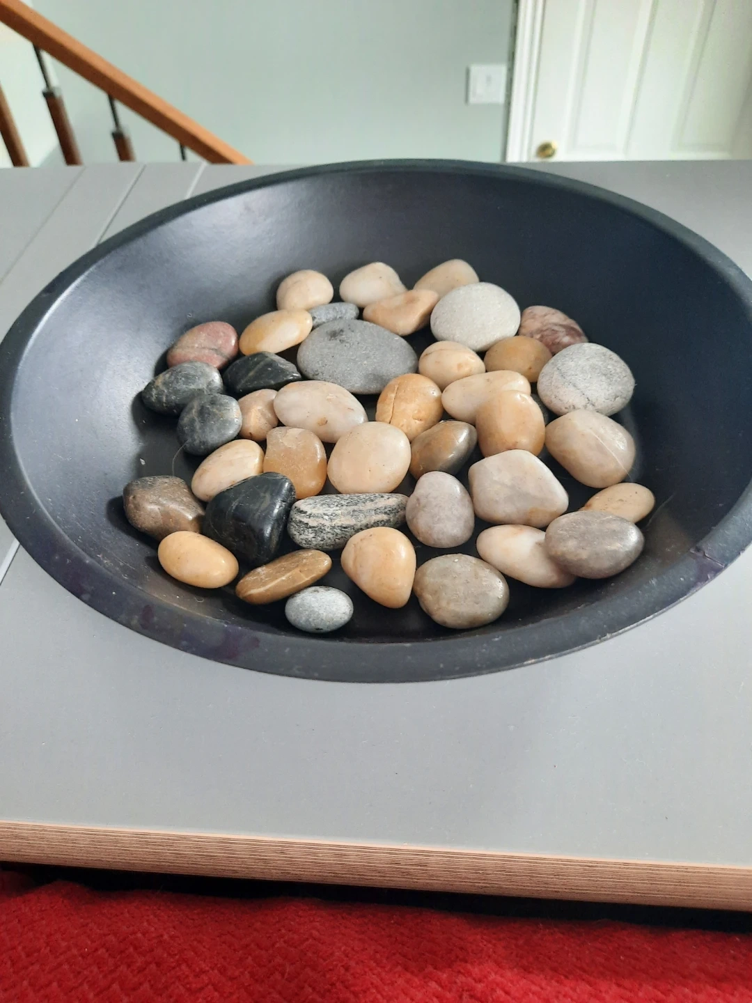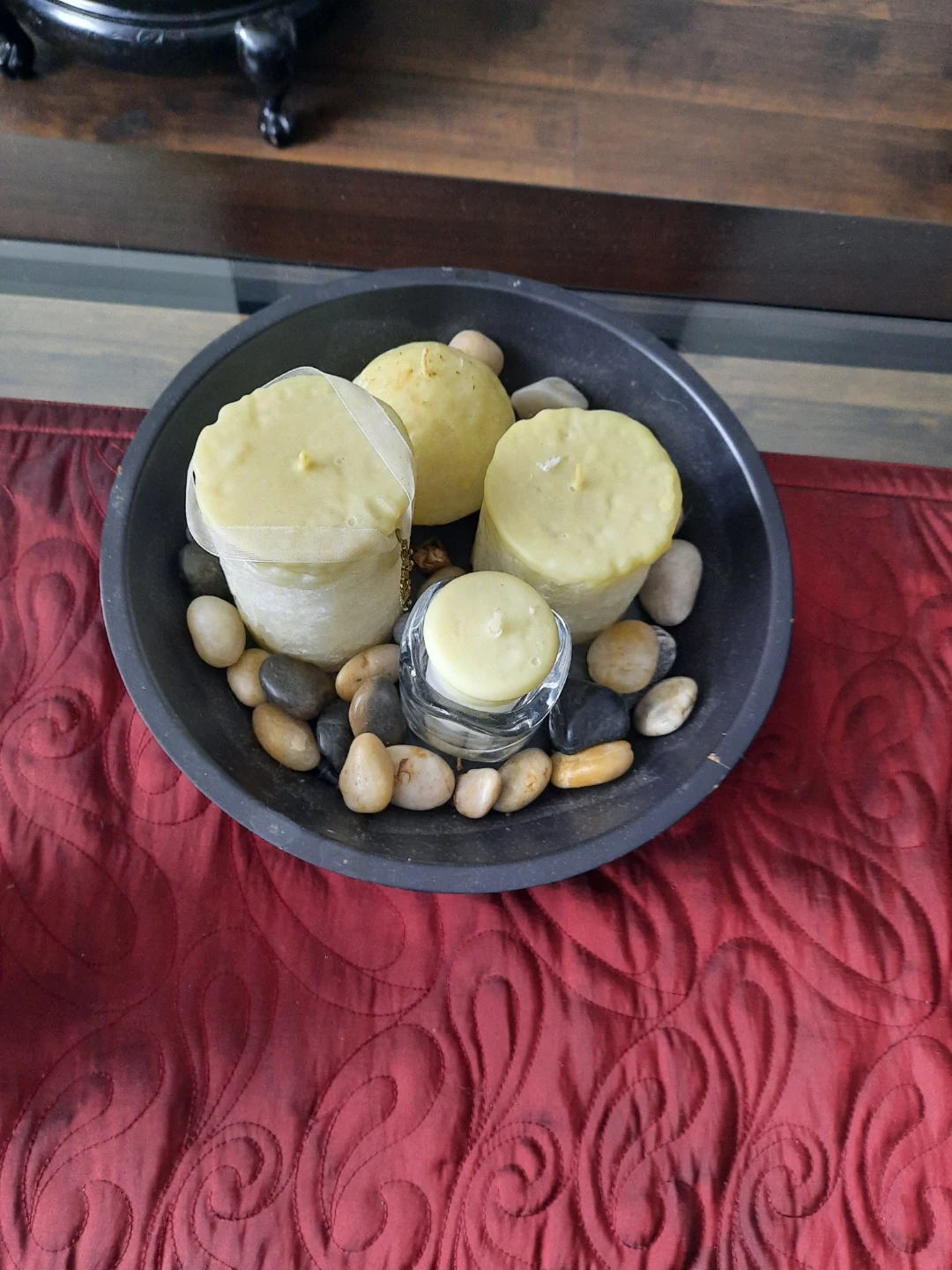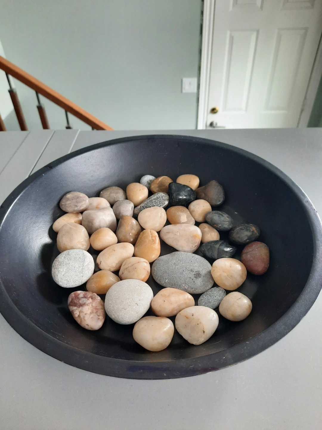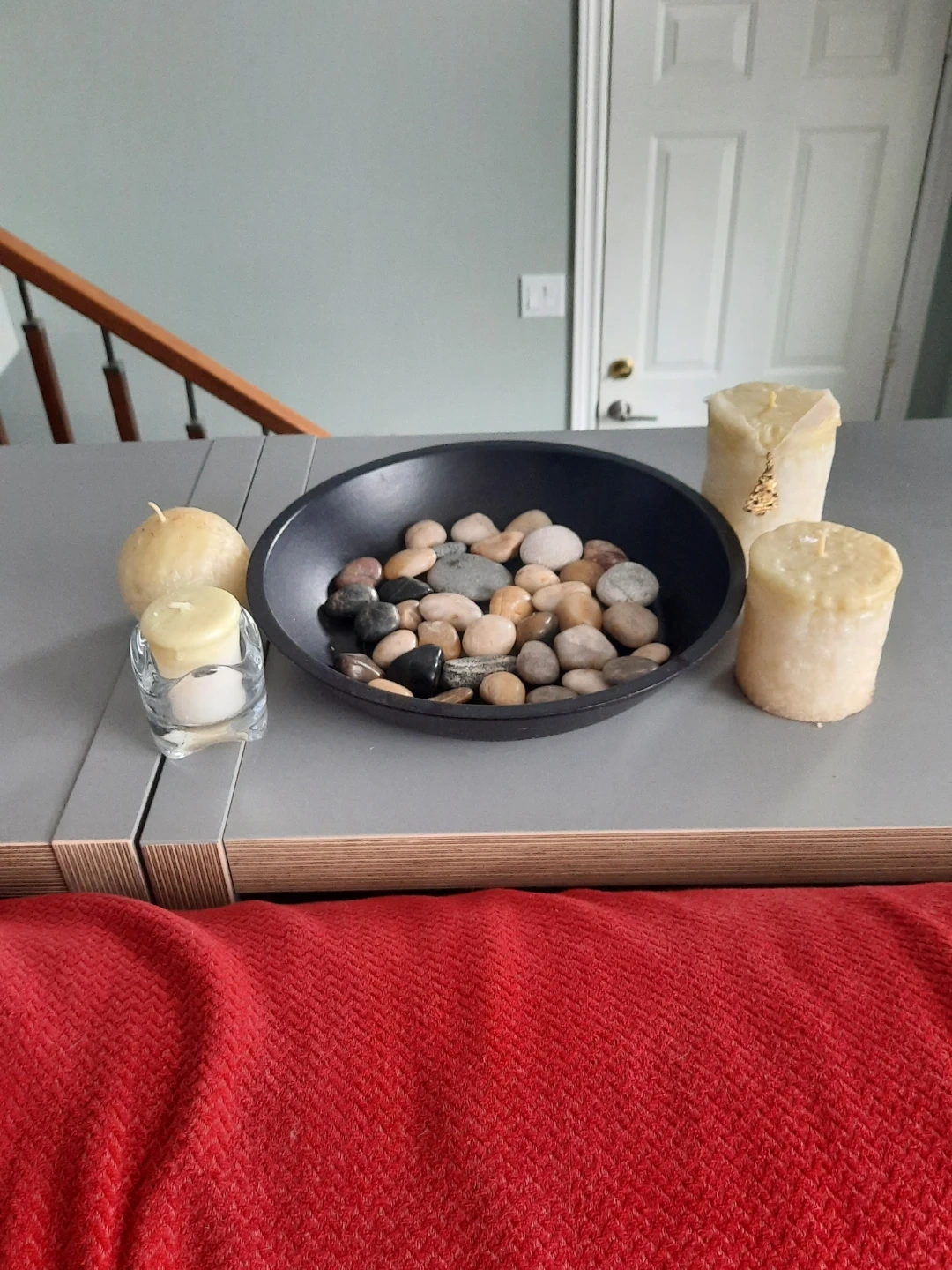 Hello decorator and stealth shopper! 🤗 I have a set of four decorative pillar candles nestled in a black bowl with assorted smooth stones. The candles are hand made and have a natural, textured finish and cream colour. This arrangement adds a cozy, earthy touch to any space.
