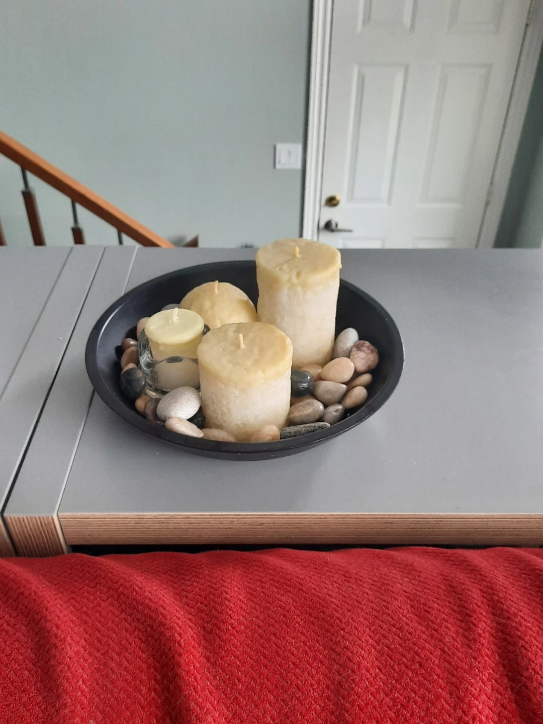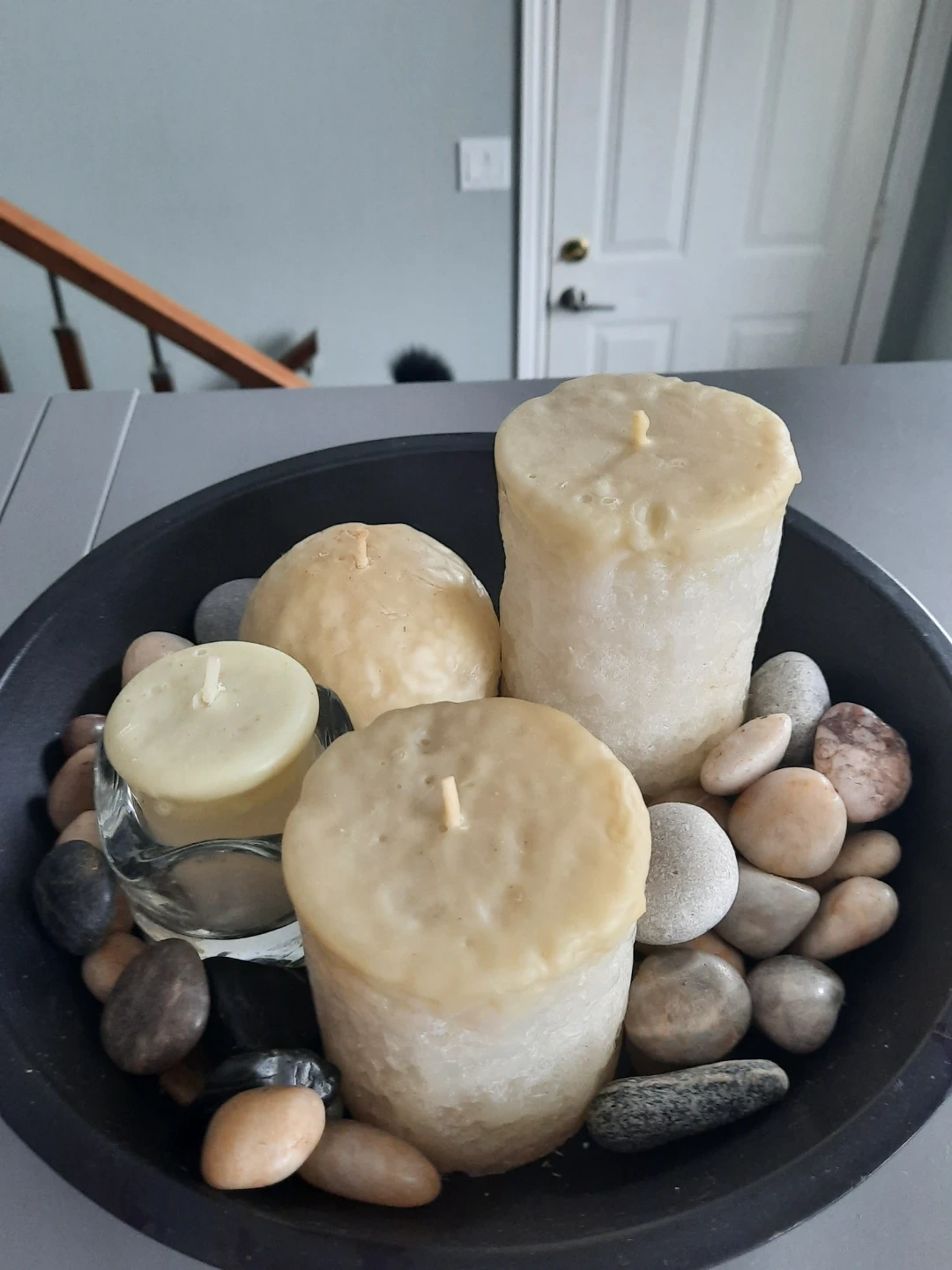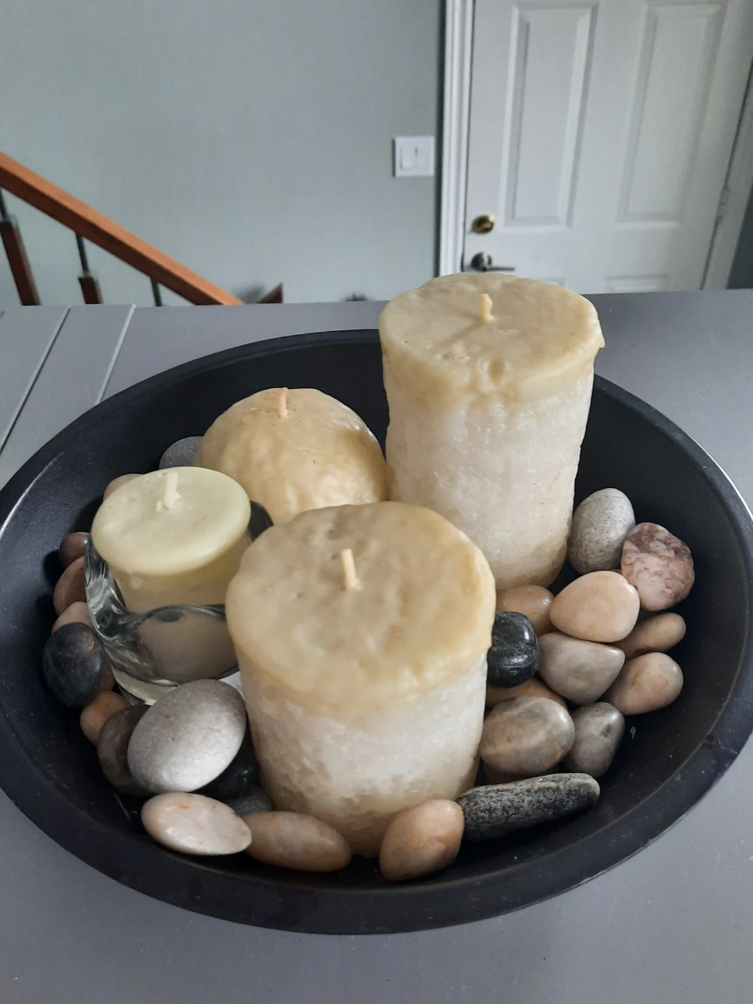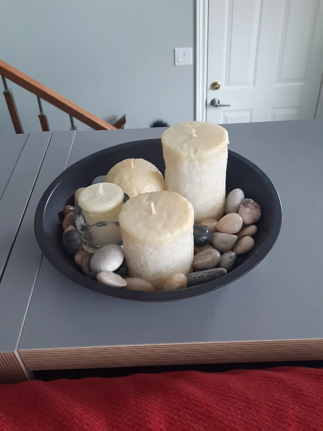 Hello decorator and stealth shopper! 🤗 I have a set of four decorative pillar candles nestled in a black bowl with assorted smooth stones. The candles are hand made and have a natural, textured finish and cream colour. This arrangement adds a cozy, earthy touch to any space.