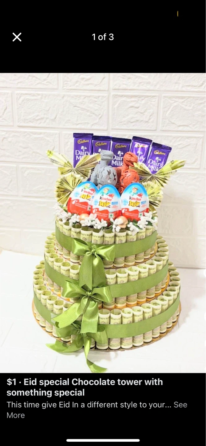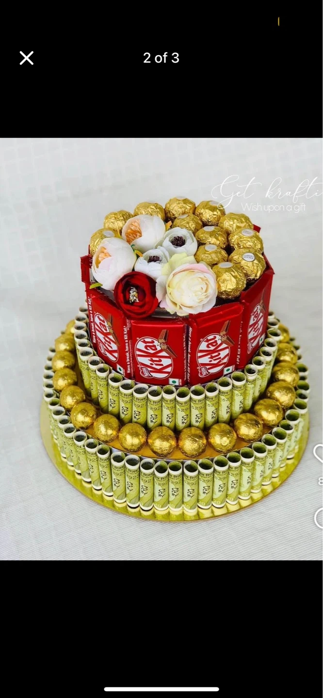 This is a two-tier chocolate and money tower, decorated with Cadbury Dairy Milk bars, Kinder Surprise eggs, and Ferrero Rocher chocolates. It's wrapped with currency notes and finished with a satin ribbon and artificial flowers. It's a unique gift for celebration 🎉taking order according to your budget. Dm me for more information