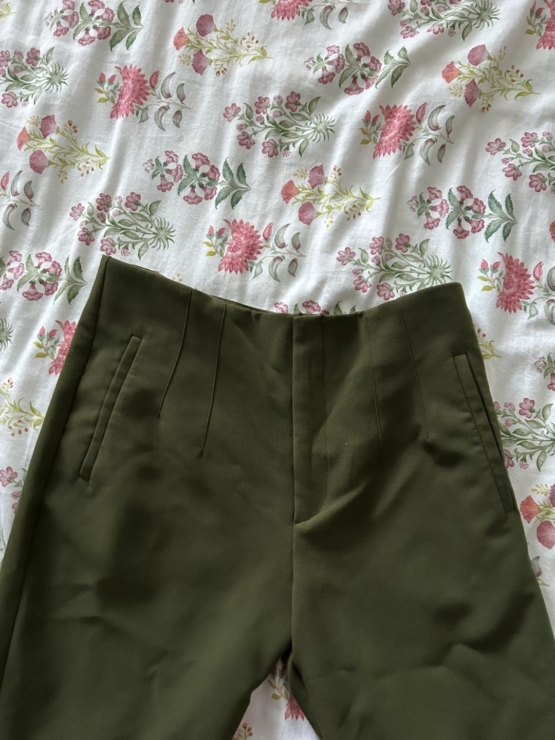 These are Stradivarius olive green trousers. They're a size 12 US. The material appears to be a blend, offering a smooth finish. Perfect for work or casual wear!