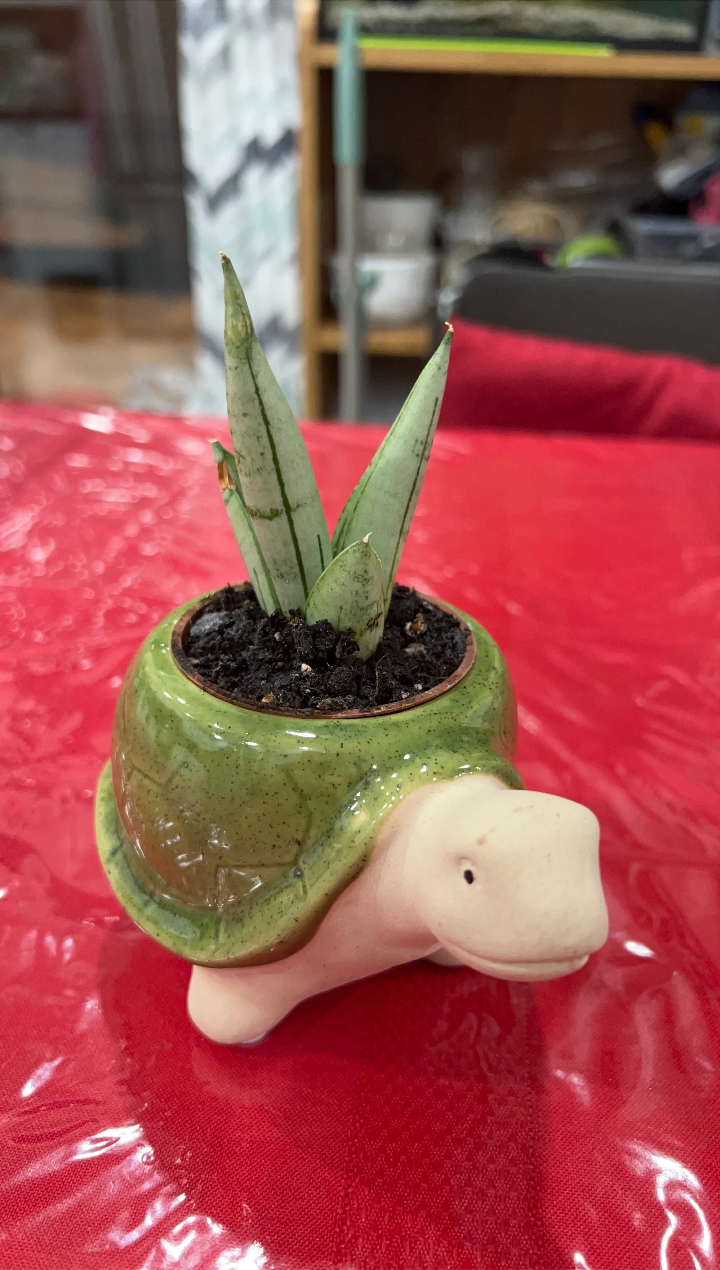 Cute ceramic planter shaped like a turtle. It's holding a live Sansevieria plant. Perfect for adding a bit of green to your space!