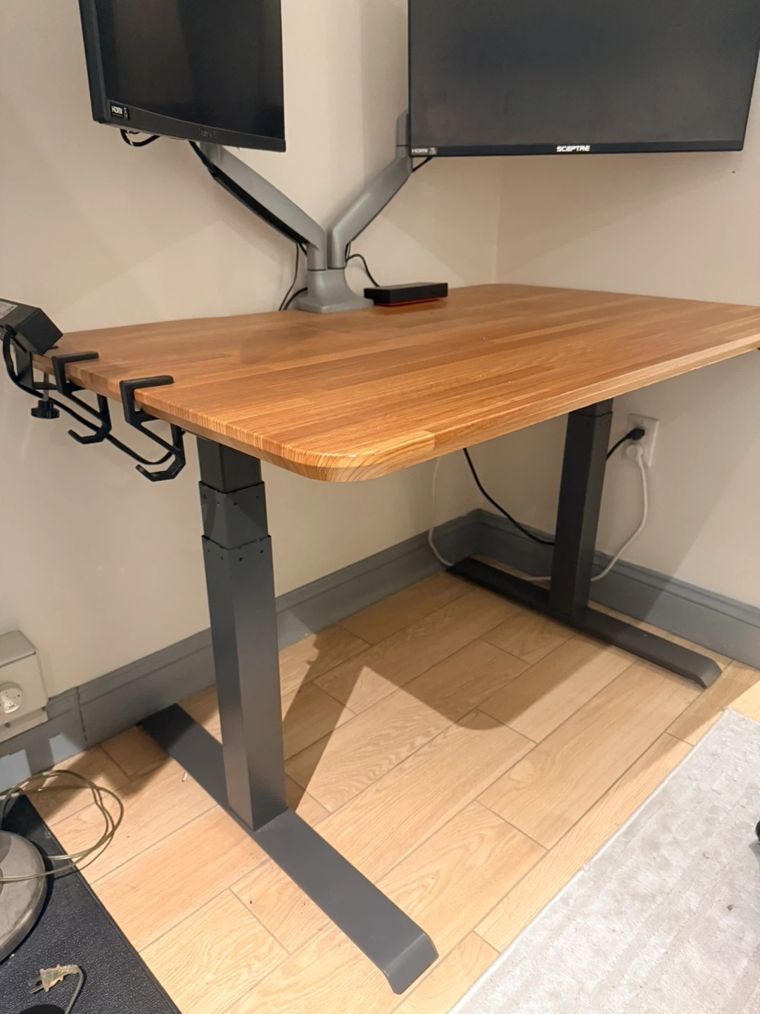 Vari brand. This adjustable standing desk features a beautiful wooden top. The desk's height is easily adjustable with a control panel that can save 4 programmed heights. The desk also comes with two hooks to hang headphones or a bag, a cable management tray, and a power hub that clamps to the desk. The power hub has 3 plugs and 2 USB slots