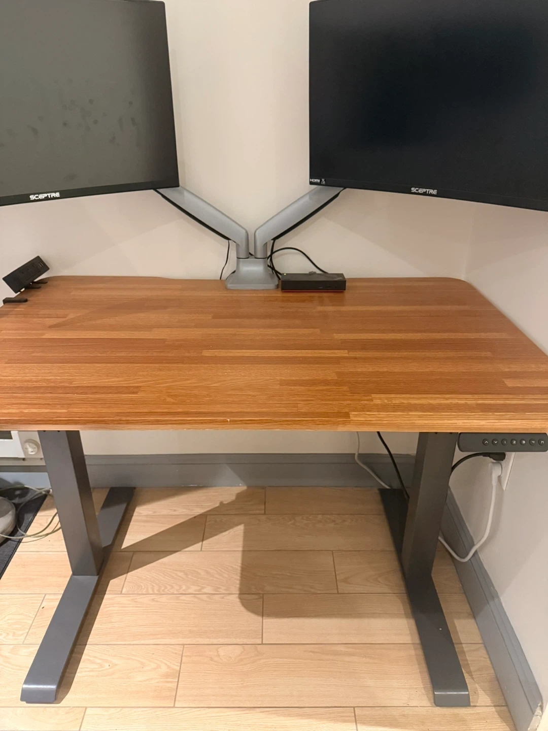 Vari brand. This adjustable standing desk features a beautiful wooden top. The desk's height is easily adjustable with a control panel that can save 4 programmed heights. The desk also comes with two hooks to hang headphones or a bag, a cable management tray, and a power hub that clamps to the desk. The power hub has 3 plugs and 2 USB slots