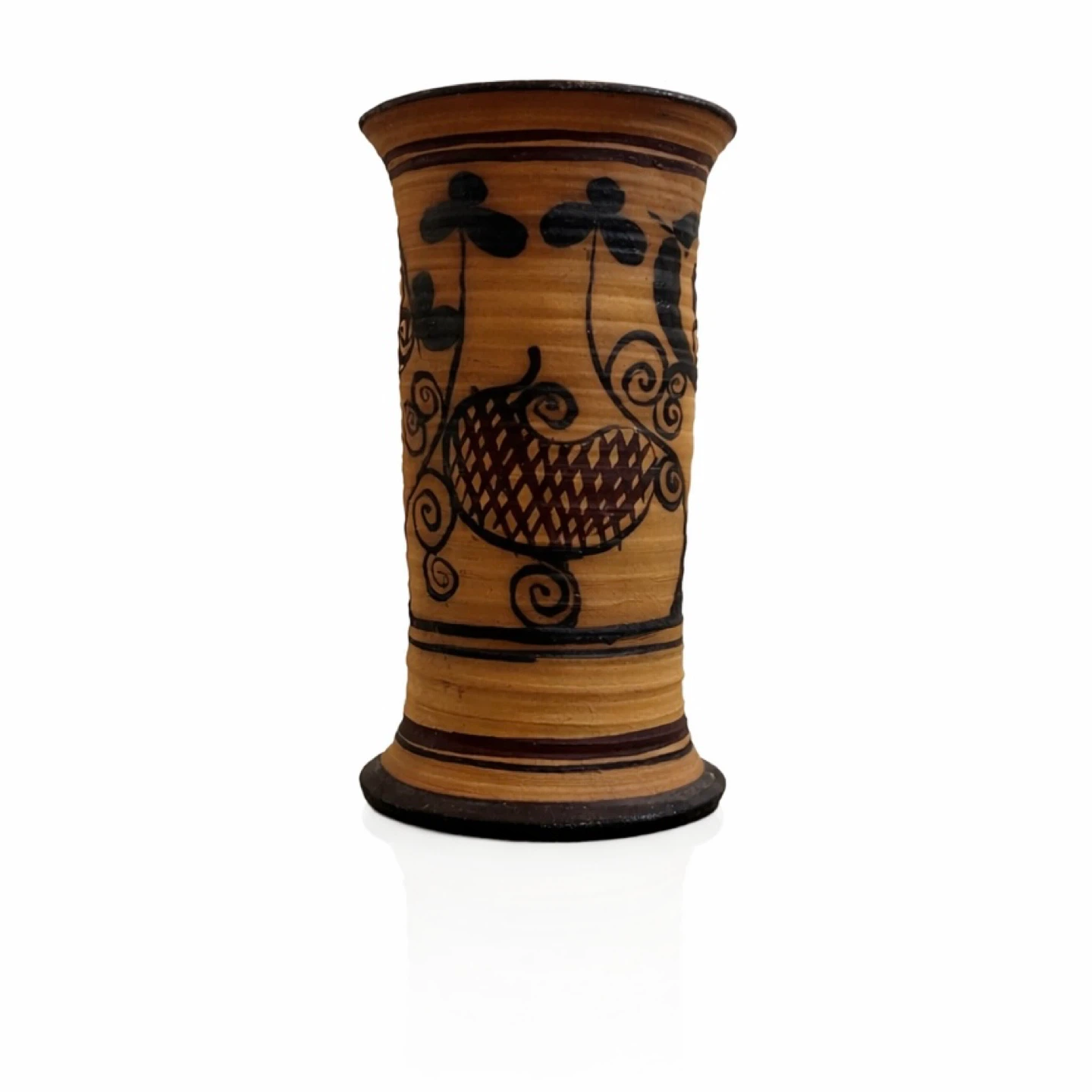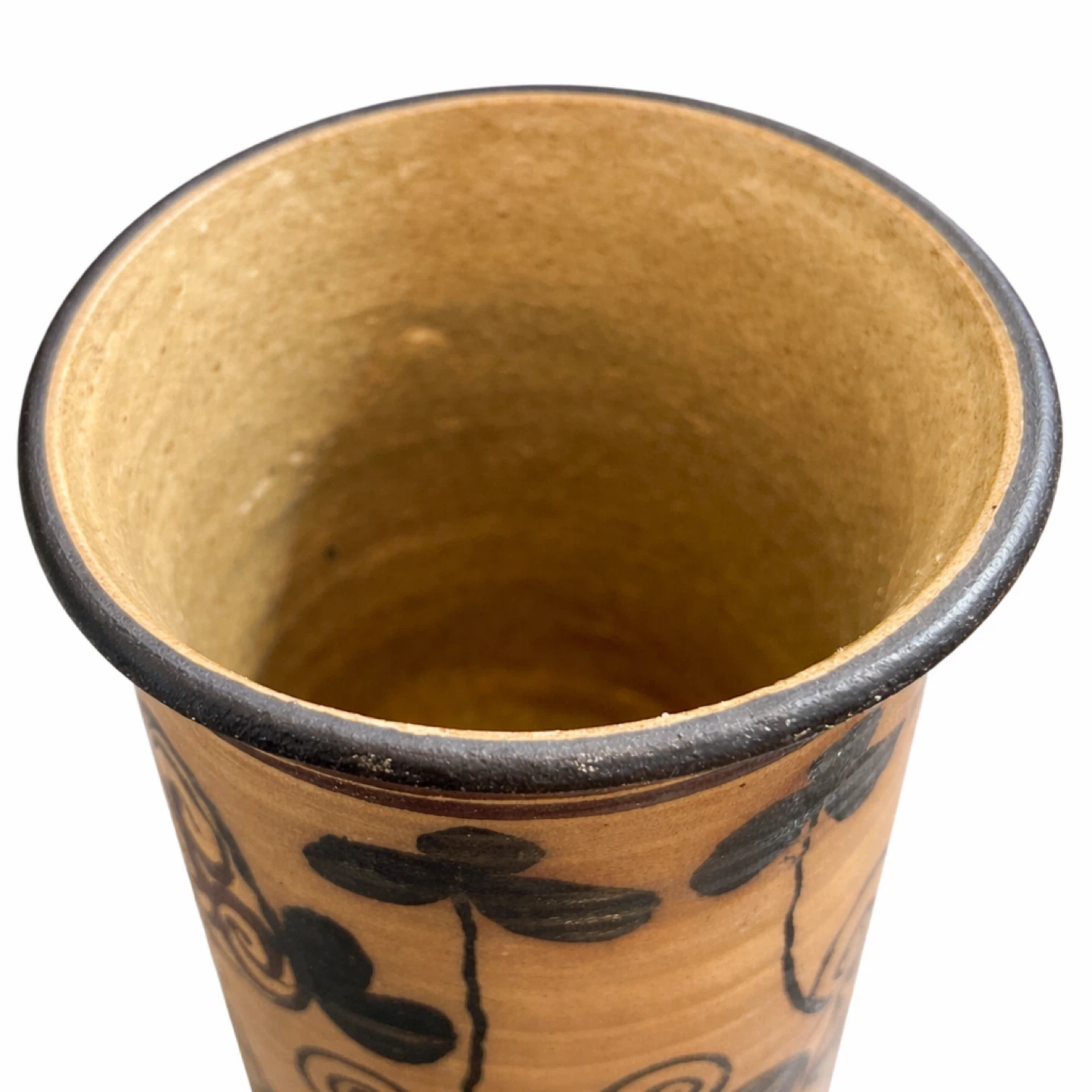 A finely proportioned YAEL-marked vase with bold, folk-modern floral ornament—scrolling vines, stylized blossoms, and cross-hatched cartouches—painted in deep iron-black and aubergine tones over a warm buff body. The form is classic and architectural: a gently waisted cylinder rising to a clean flare at the mouth, anchored by a stable foot. Strong shelf presence; equally effective as a small vase or decorative vessel.