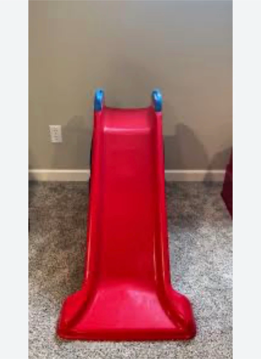 It's a bright red kids play slide with blue accents. Made of durable plastic for indoor or outdoor fun. It's great for toddlers and young children to enjoy!