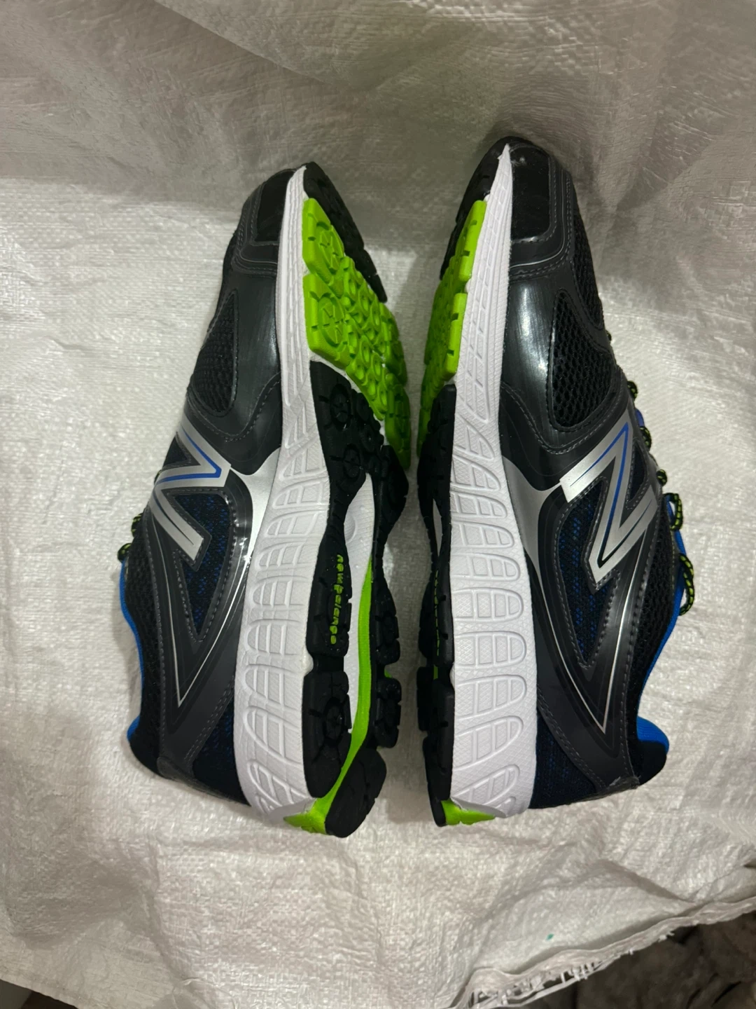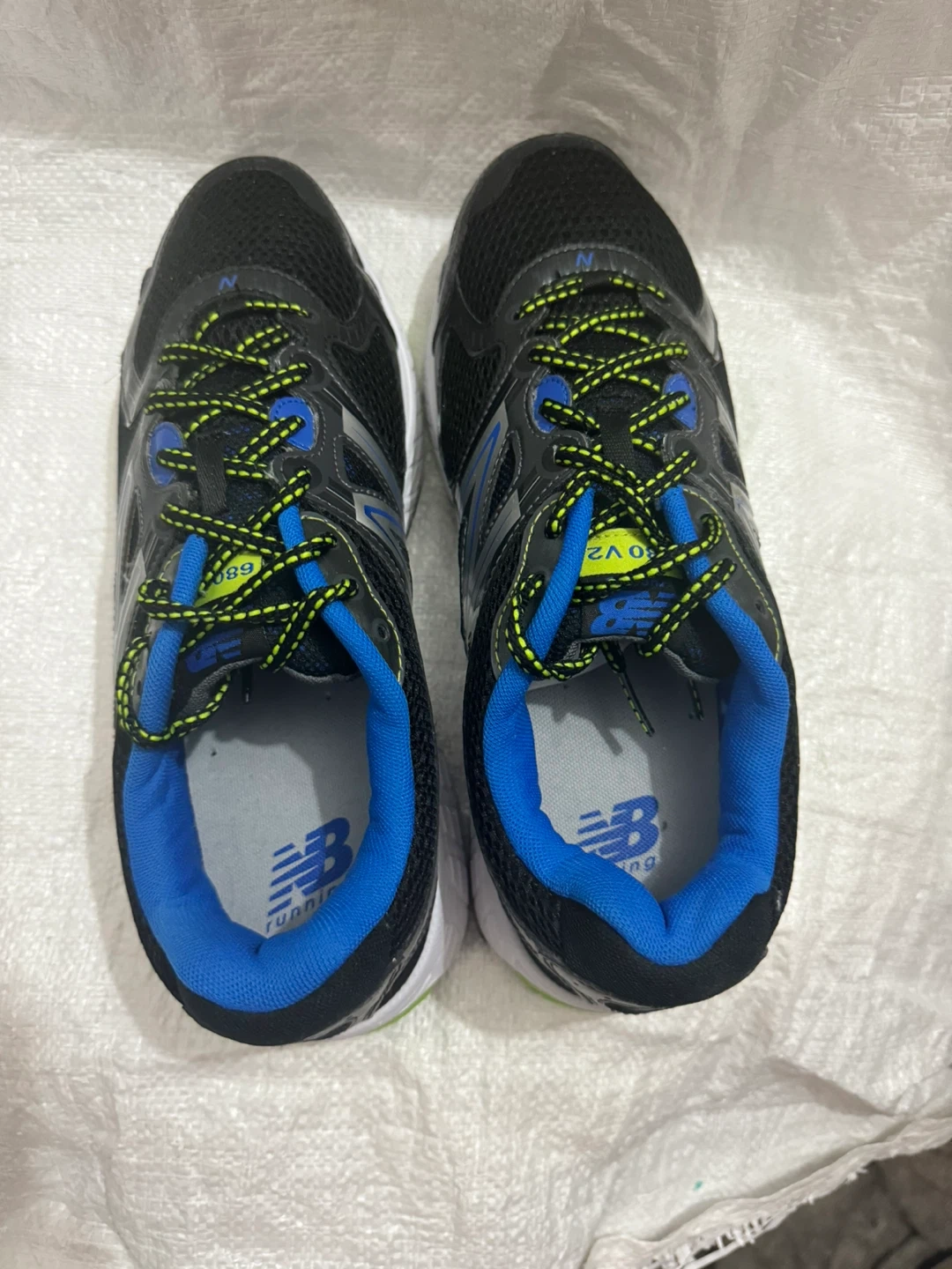 Black and blue New Balance 680v2 running shoes. Mesh and synthetic material. These are great for hitting the pavement or treadmill!