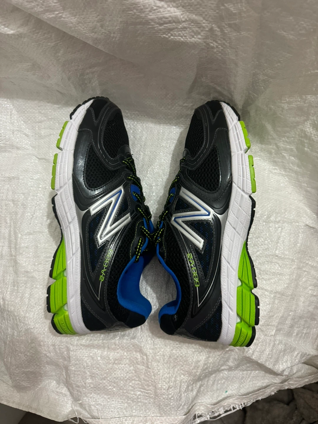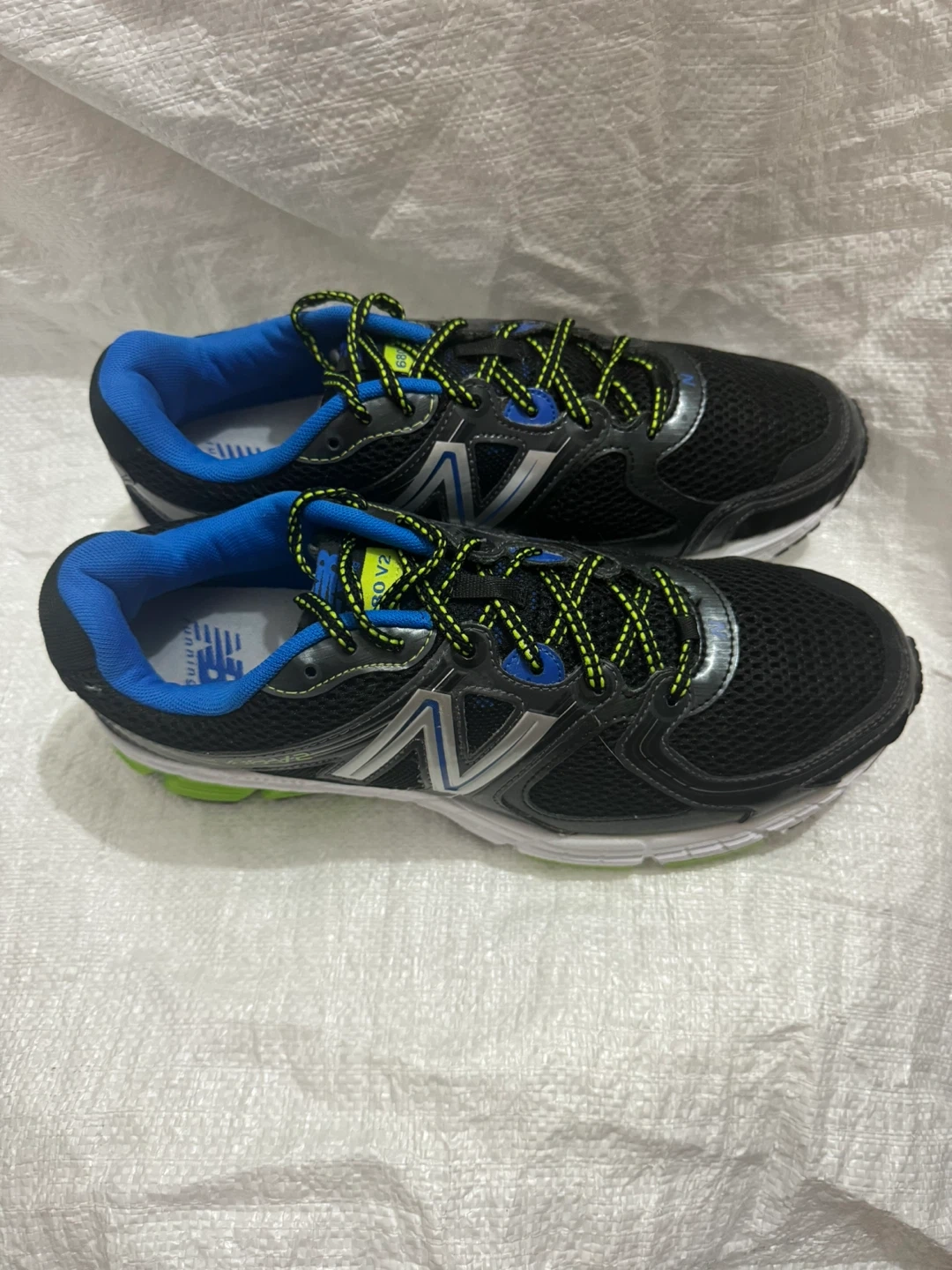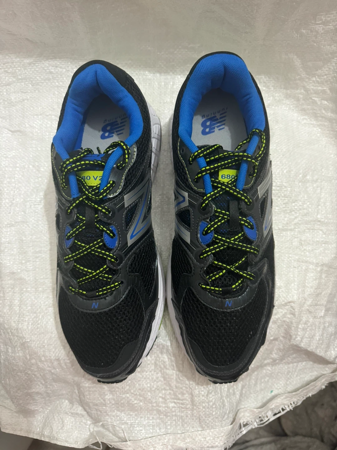 Black and blue New Balance 680v2 running shoes. Mesh and synthetic material. These are great for hitting the pavement or treadmill!