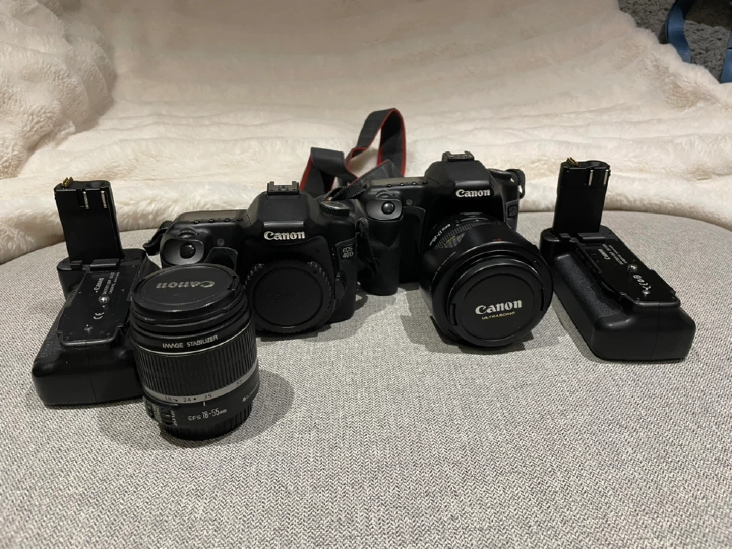 Selling 2 Canon 40D cameras with a canon EF-S 18-55mm F/3.5 and a EF-S 17-85mm F/4 lens. Comes with 2 Canon battery grips BG-E2N.