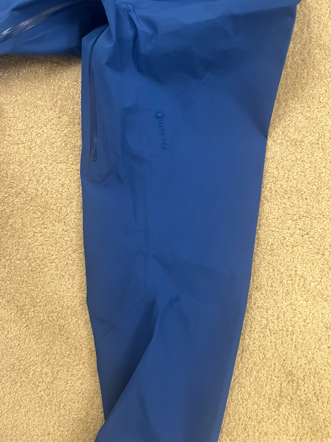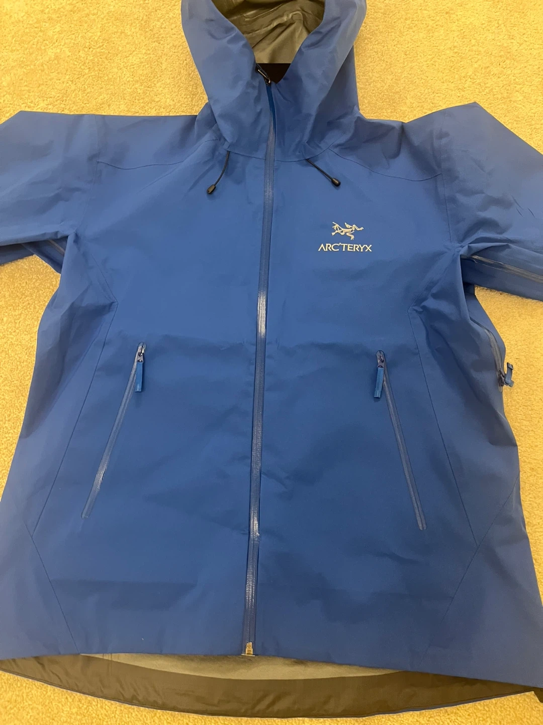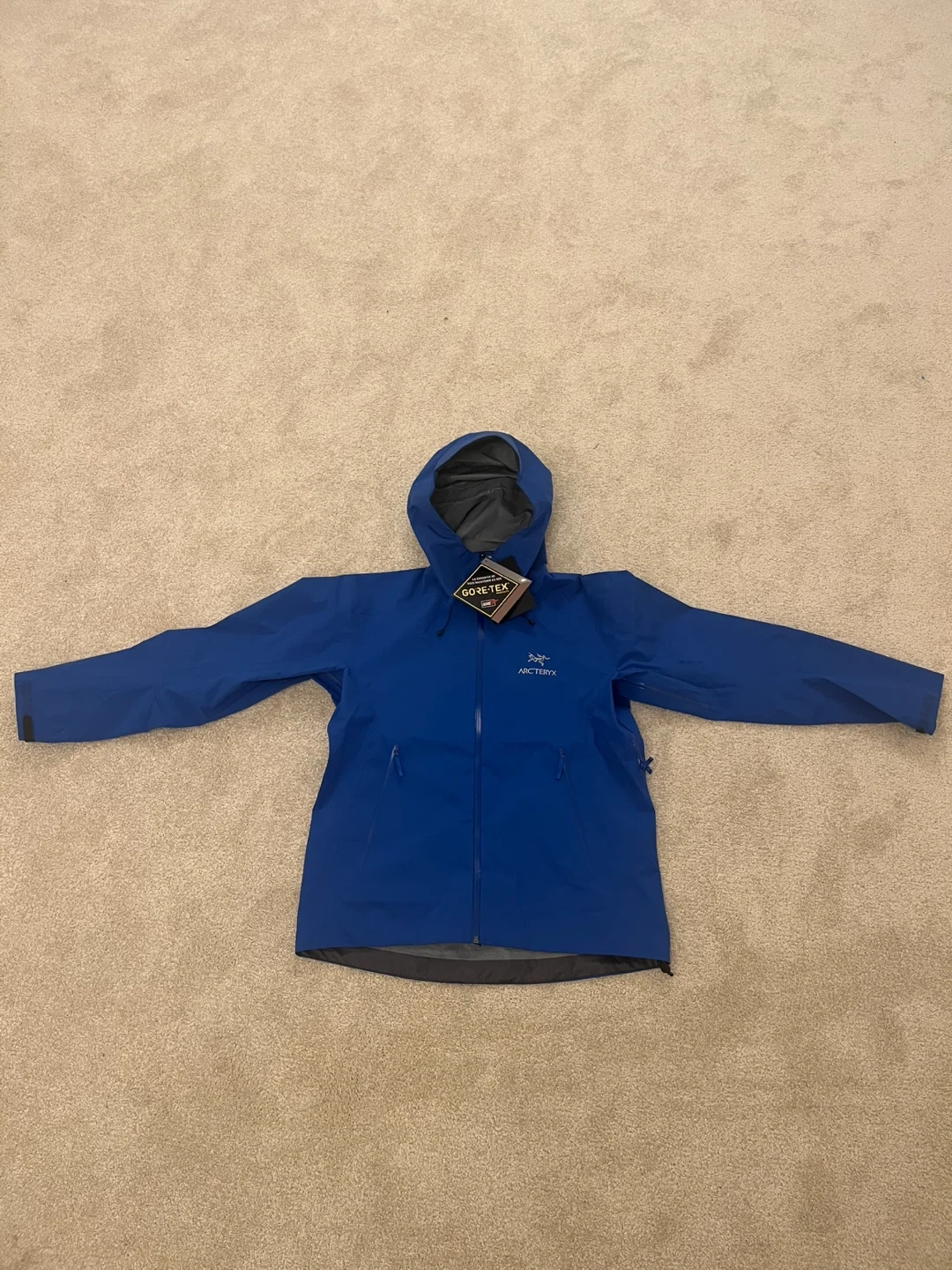 Arc'teryx men's jacket in blue, size L. Made with Gore-Tex for waterproof protection. Features a hood and zippered pockets.