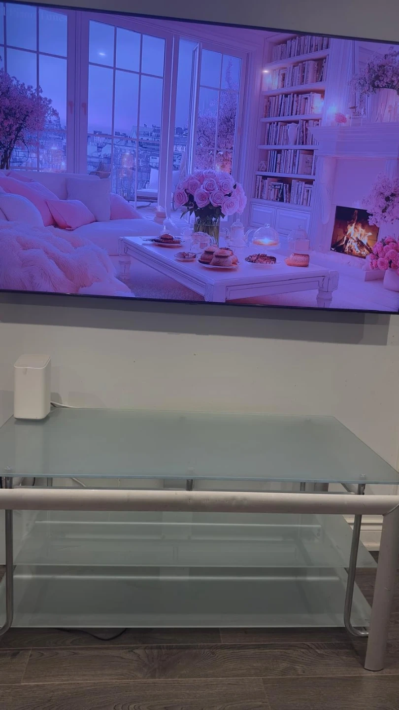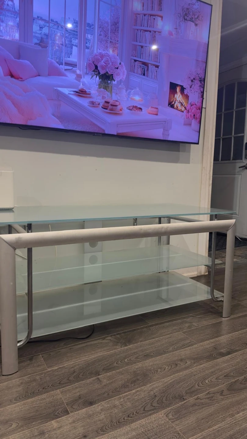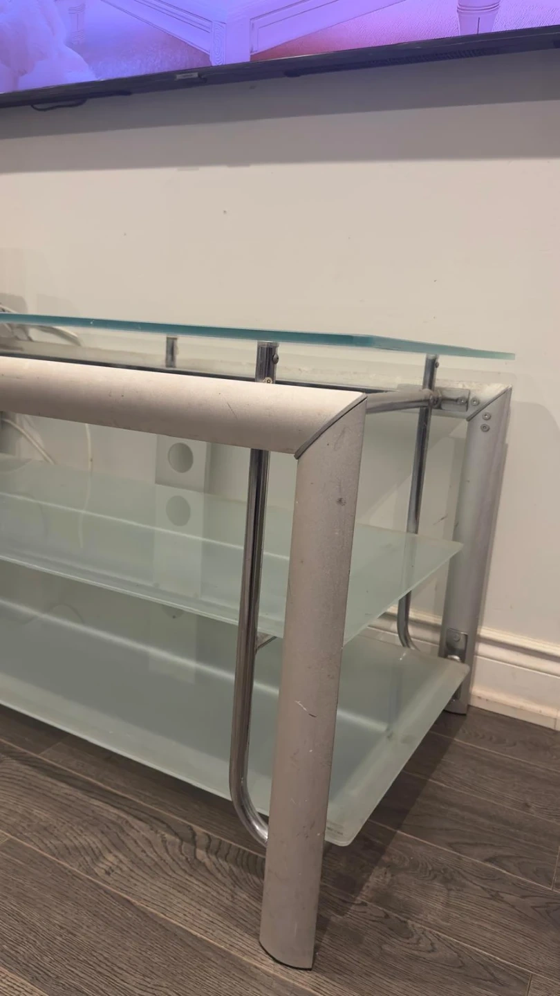 Spruce up your living space with this sleek glass TV stand! It's perfect for holding your television and media devices. It has a top glass shelf, a middle glass shelf and a bottom glass shelf. This stand is in used, great condition, and it's still sturdy and functional, with no cracks. It’s ready to find a new home and bring some modern flair to your entertainment setup!