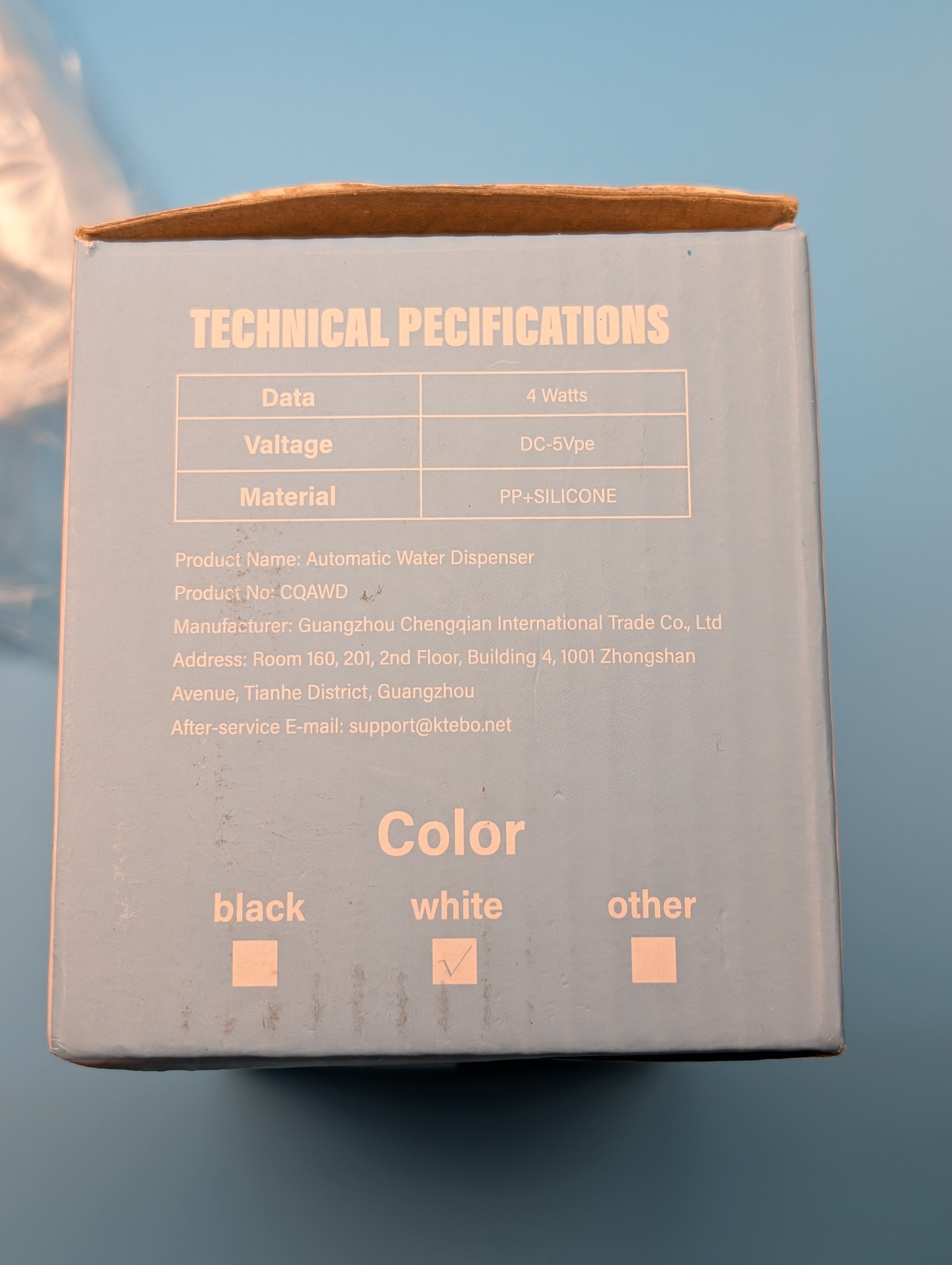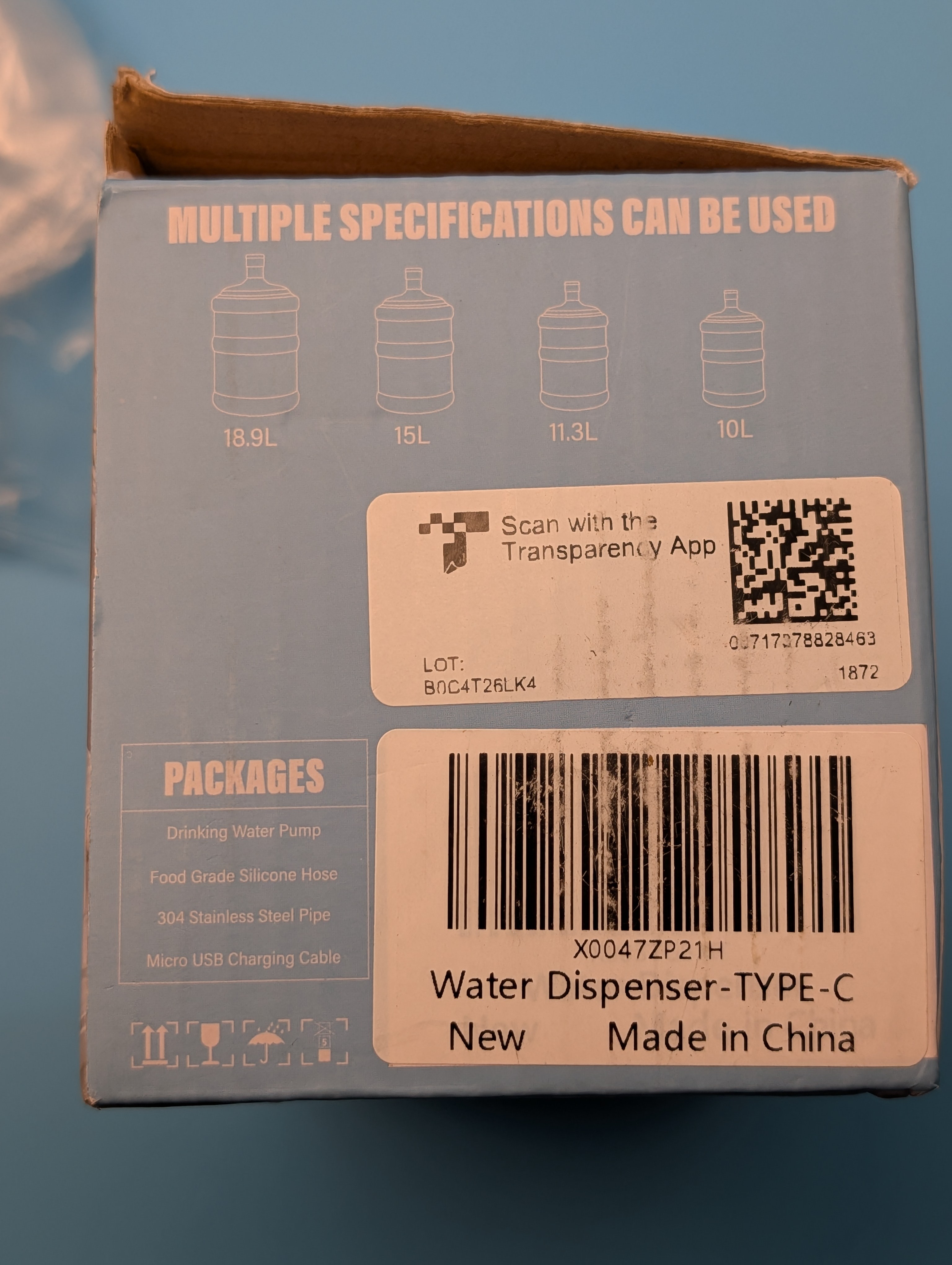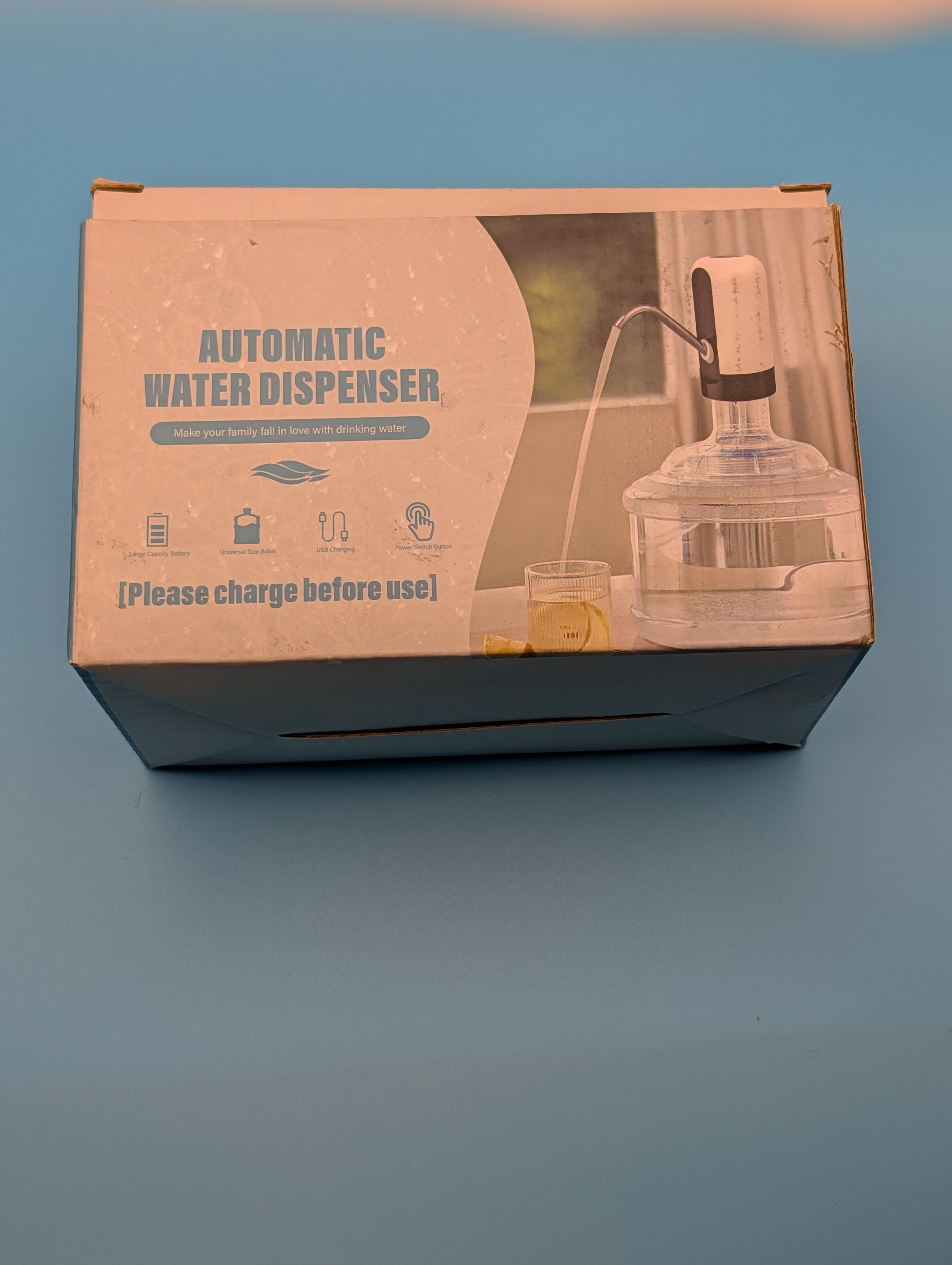 I'm selling a brand new automatic water dispenser! It comes in white and includes the drinking water pump, food grade silicone hose, and a micro USB charging cable. It's compatible with 18.9L, 15L, 11.3L, and 10L bottles. It runs on 4 watts and uses DC-5Vpe voltage. The material is PP+Silicone.