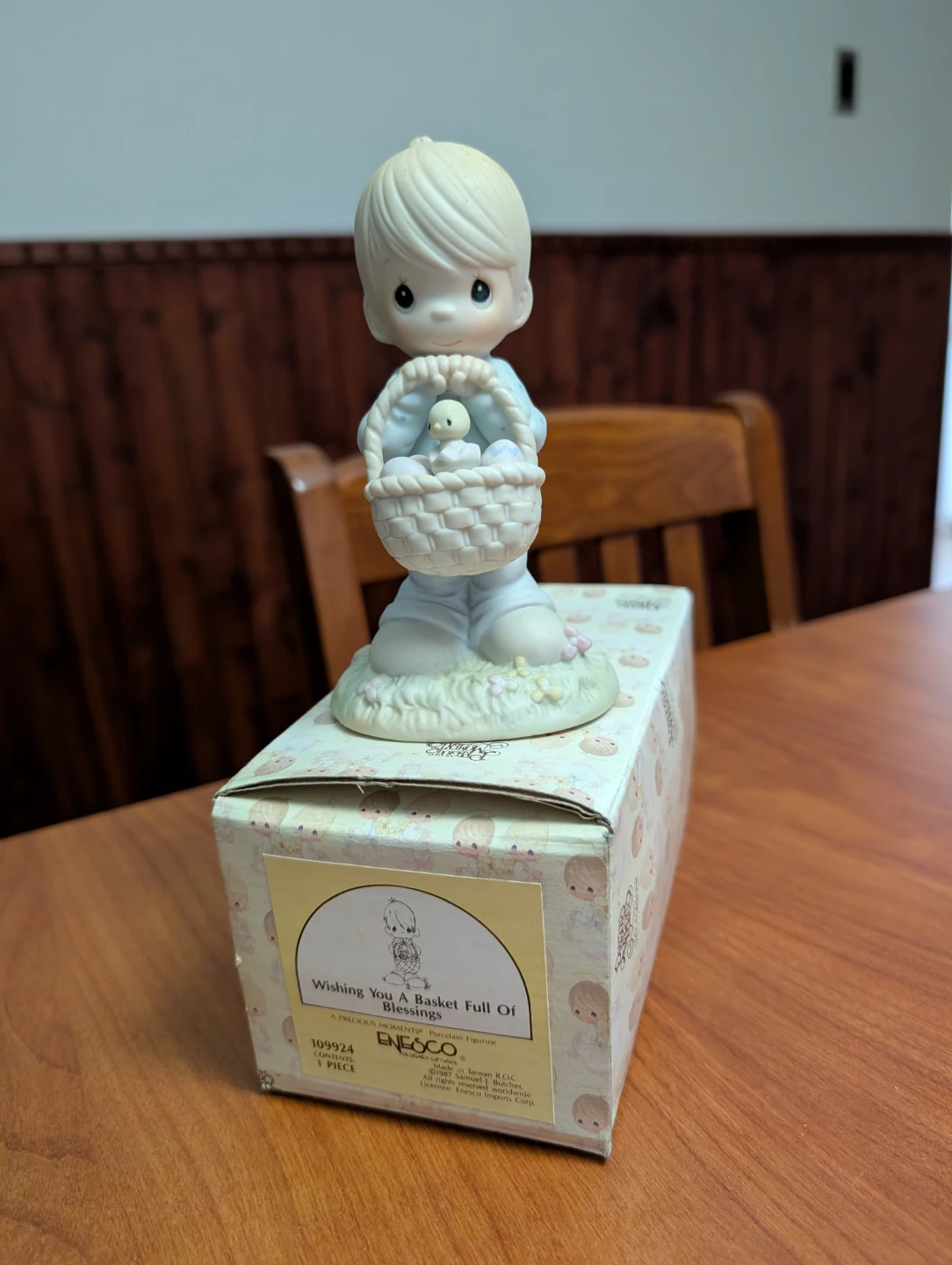 This Precious Moments figurine features a boy holding a basket with a chick and Easter eggs. It's made of porcelain and was made in Taiwan R.O.C. This item comes with its original box.