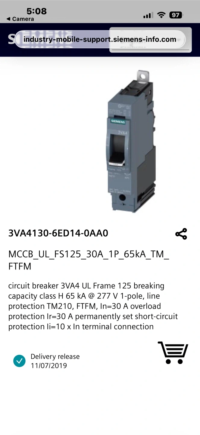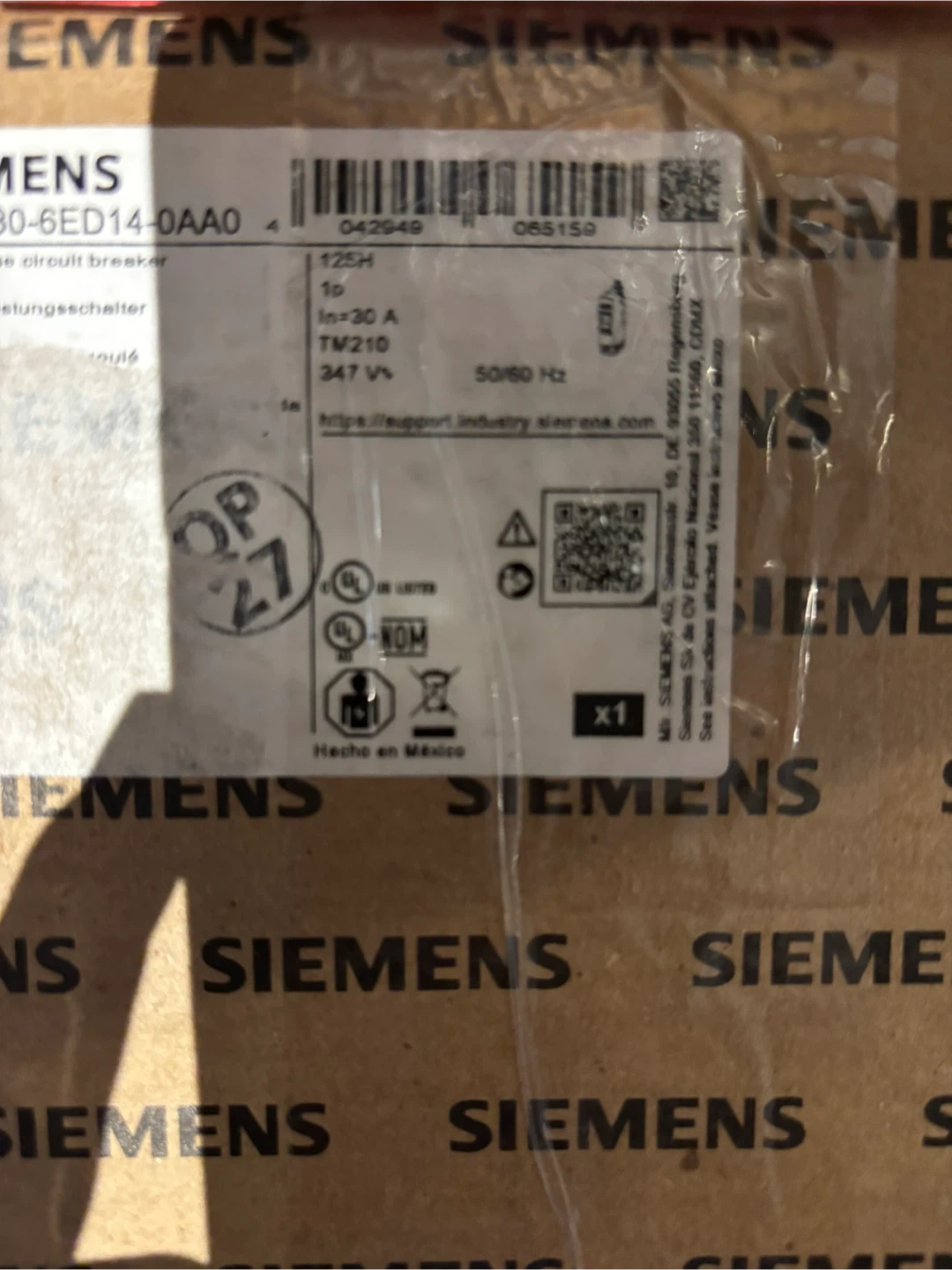 2 New Siemens 3VA4 UL Frame 125 circuit breaker. It has a 30A overload protection and a permanently set short-circuit protection. This is a 1-pole breaker rated for 277V. $300 each.