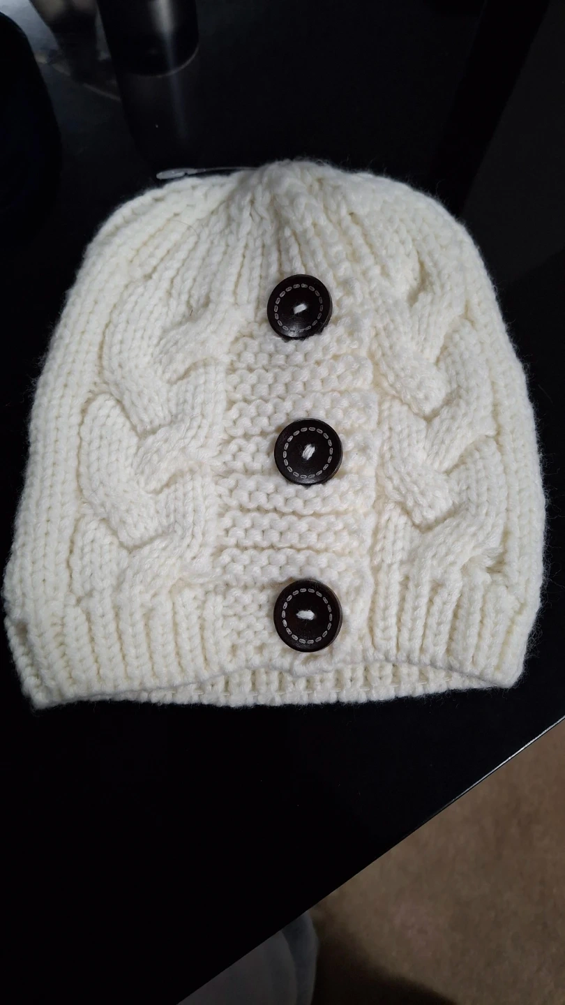 This cozy cream-coloured knit beanie features a classic cable knit pattern. It's accented with three dark brown decorative buttons along the front. A simple yet stylish accessory for cooler weather!