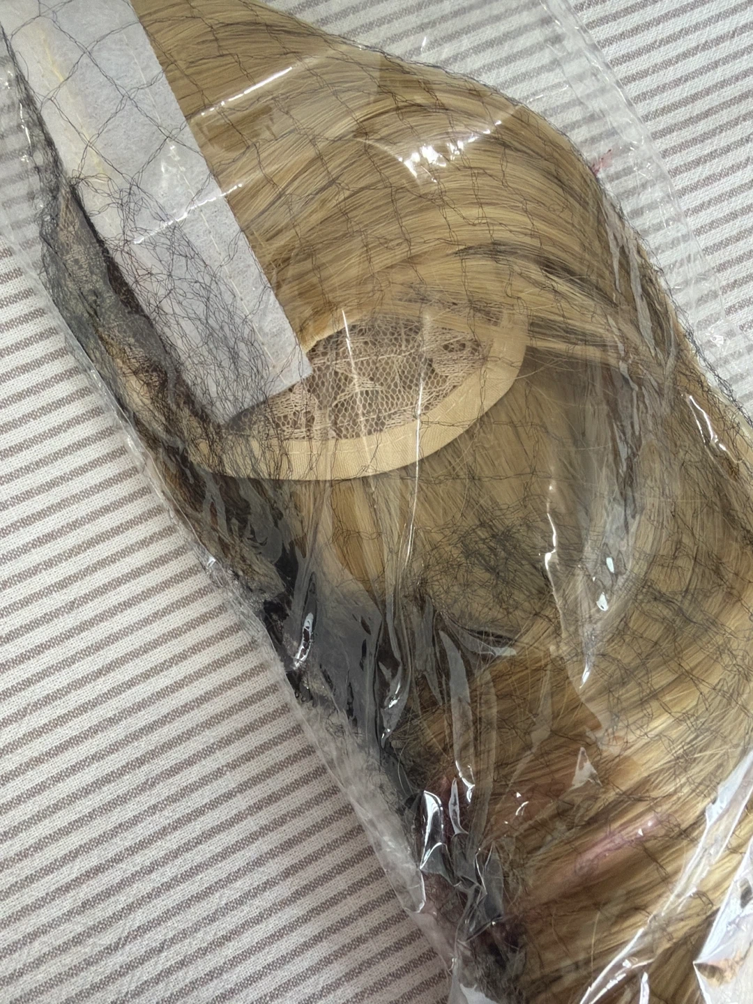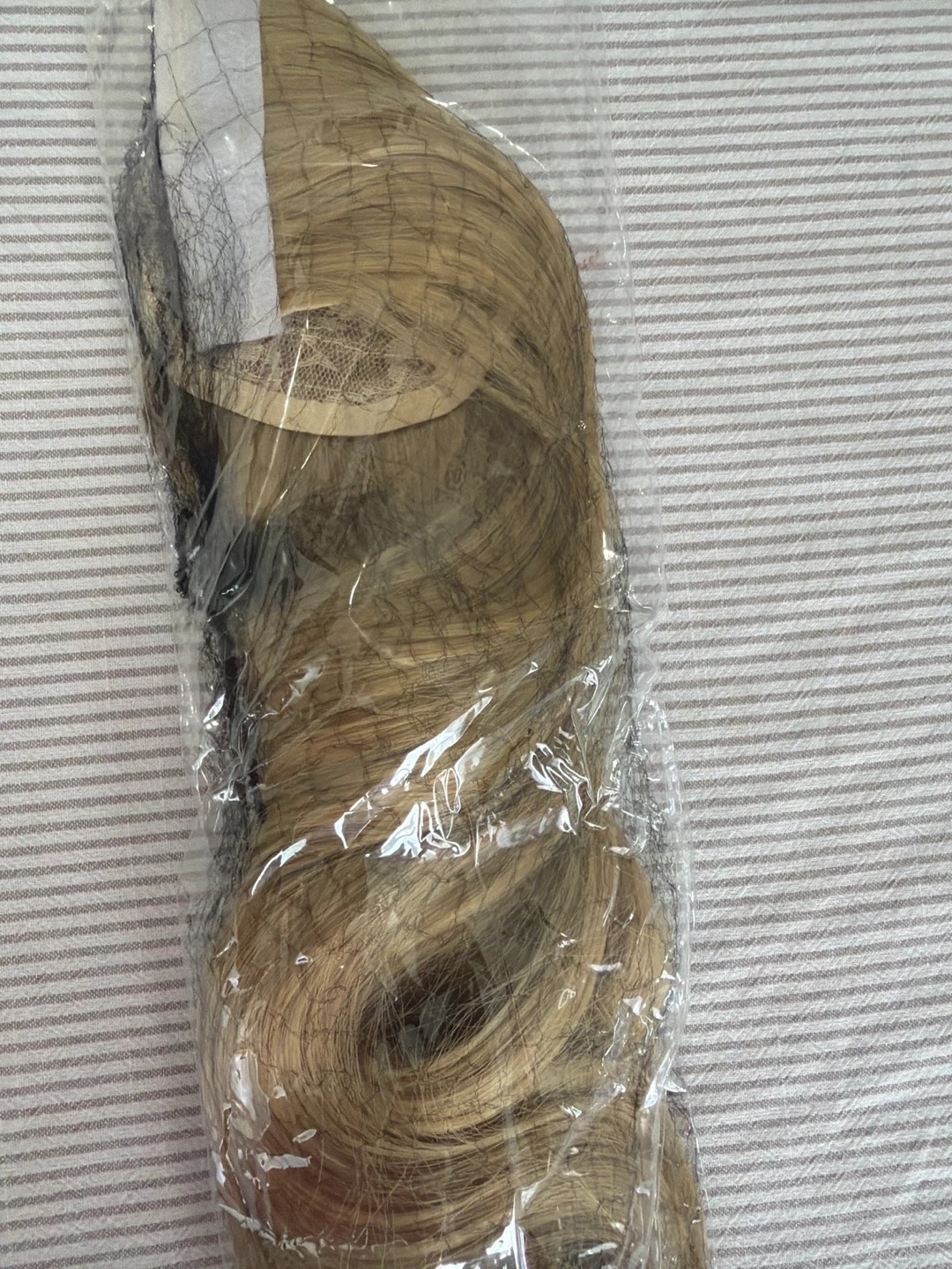 This is a wavy, blonde wrap-around ponytail extension. It attaches with clips for a secure fit. Synthetic hair material.