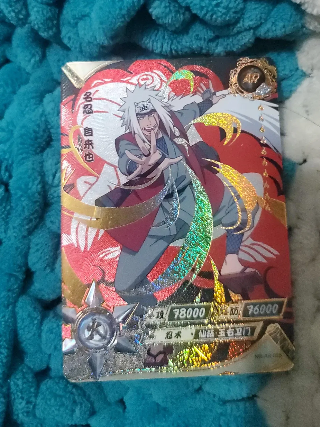 This is a collectible trading card featuring Jiraiya from Naruto. It shows his attack and defence stats as 78000 and 76000 respectively. The card is printed with the name 'Jiraiya' and the technique 'Rasengan' in Japanese.