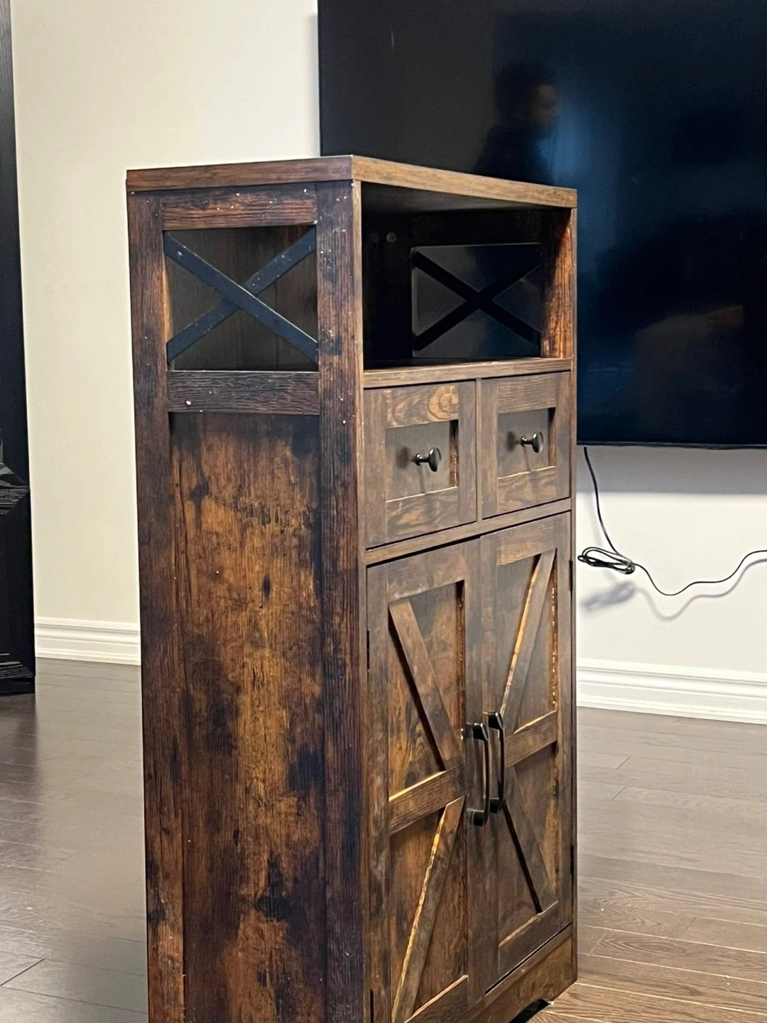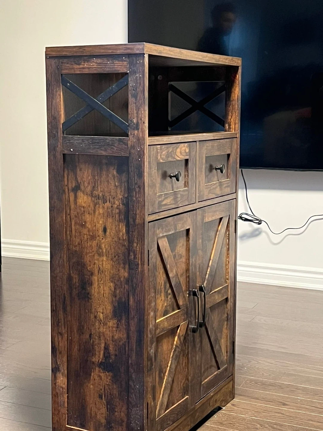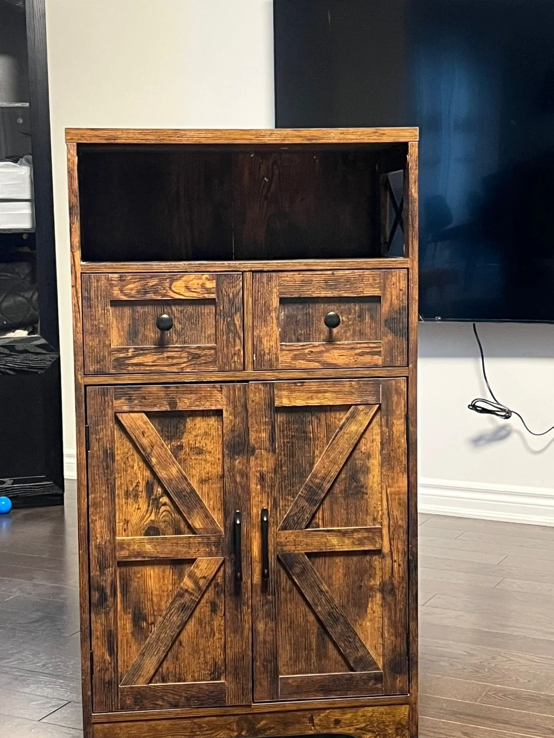 This cabinet has a rustic farmhouse aesthetic with a dark wood finish. It features double doors on the bottom and two drawers on top for storage. Perfect for adding charm and organization to any room!