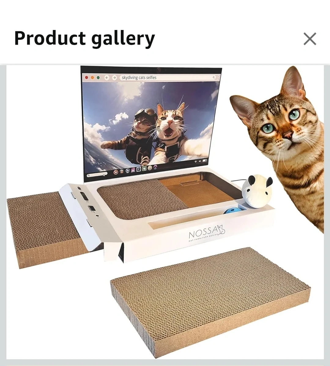 Selling a brand new NOSSA cat scratching laptop! It comes with an extra scratchpad for extended fun. The laptop also features a fluffy toy mouse and a rolling bell ball to keep your furry friend entertained. It also includes cool stickers to customize your cat's new favourite toy! The dimensions are 33 cm x 25 cm x 4 cm.