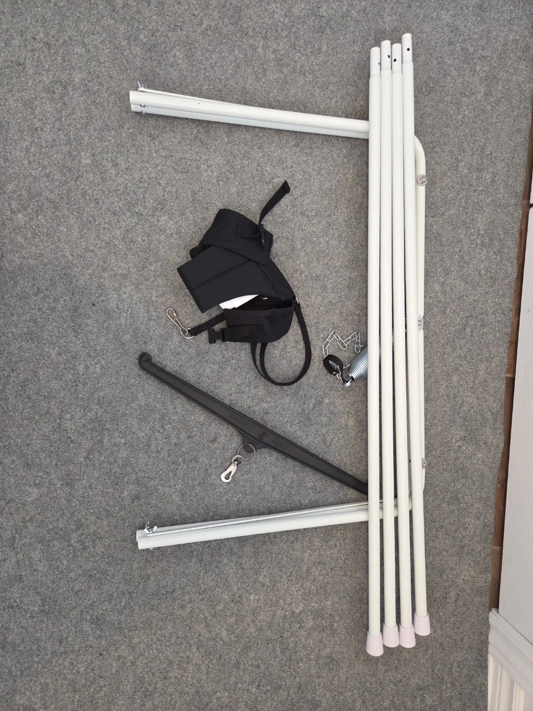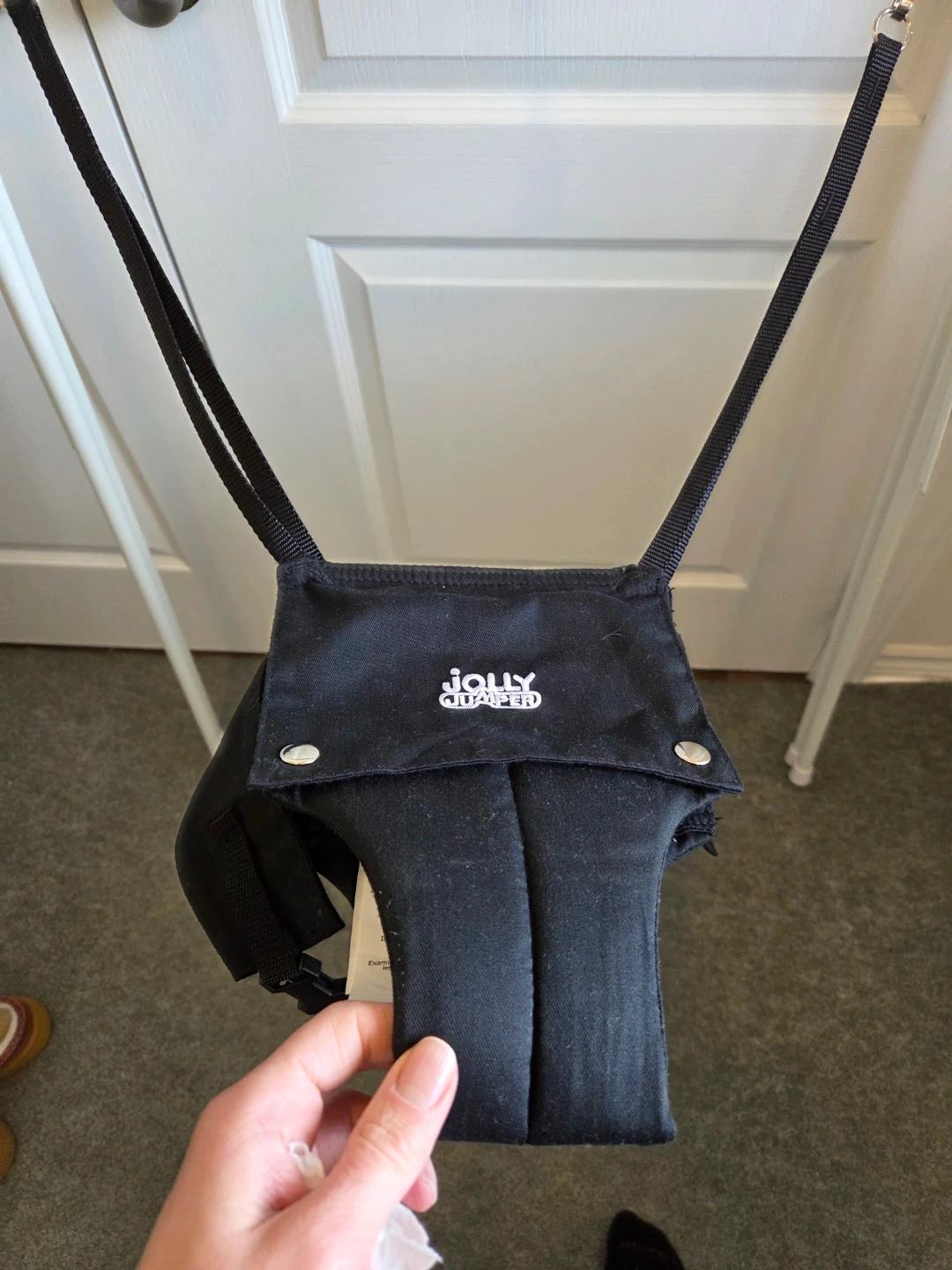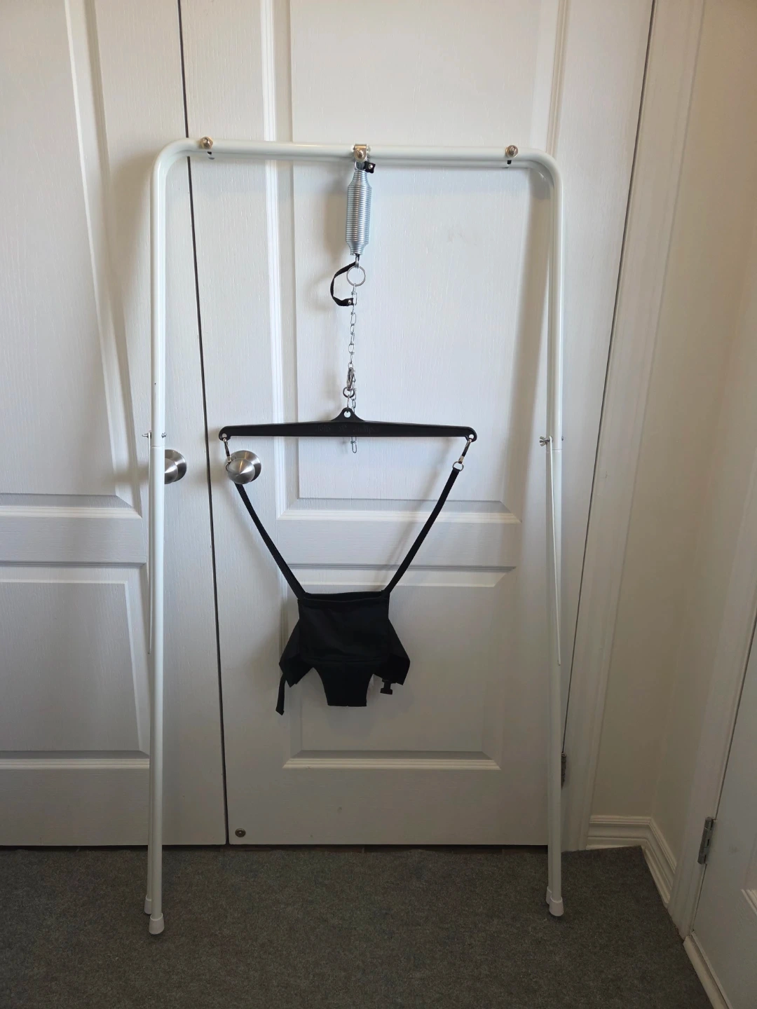 This Jolly Jumper Exerciser includes the stand for free-standing use. It's designed for babies to safely bounce and play. The exerciser has a black fabric seat and comes with a sturdy metal frame.