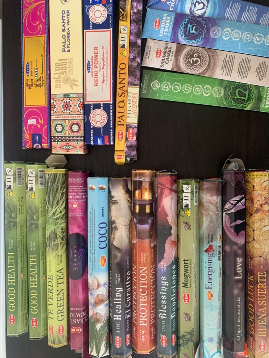 A collection of HEM brand incense sticks in various scents like Good Health, Green Tea, Coco, Protection, and more. Each pack contains incense sticks, ready to bring a pleasant aroma to your space. Ideal for creating a calming atmosphere or for spiritual practices.