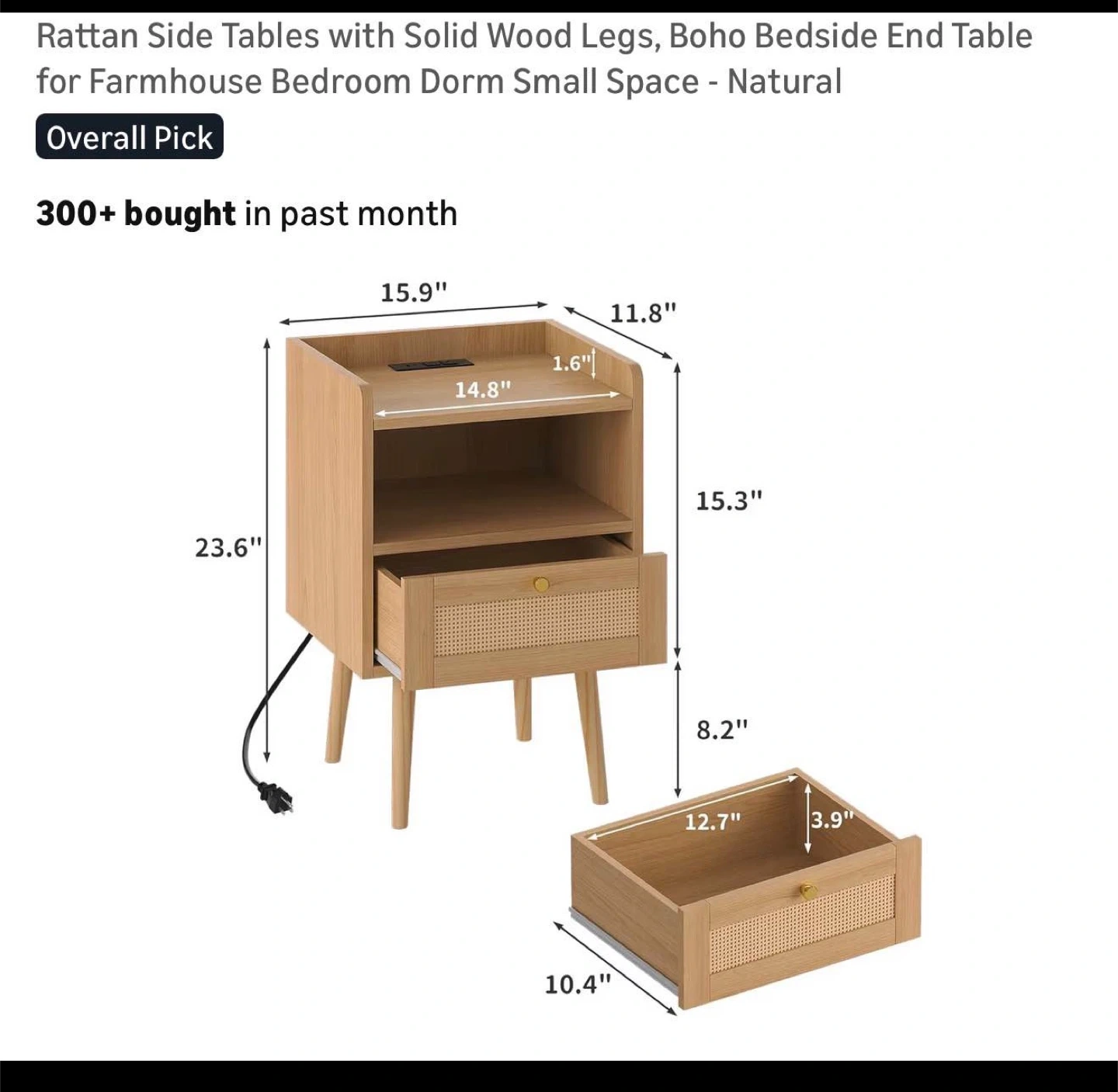 A rattan side table with solid wood legs. It's natural in colour. The overall dimensions are 15.9" wide, 11.8" deep, and 23.6" tall. This nightstand would be useful for small spaces.