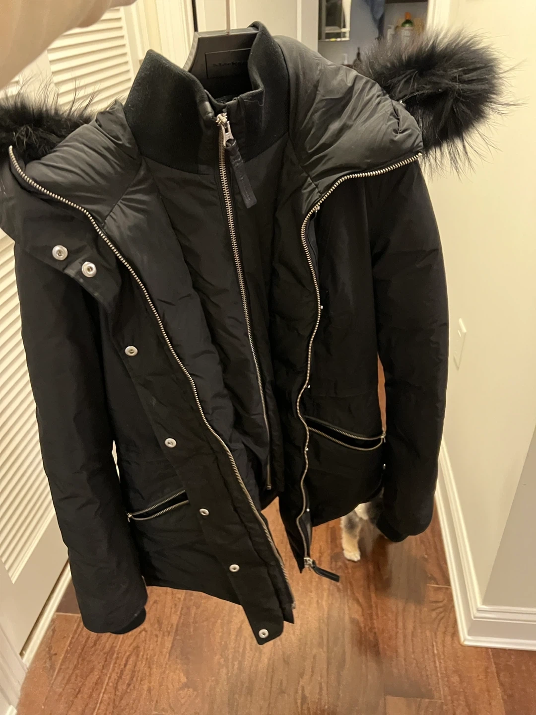 Selling a stylish black Mackage down winter coat. It features a fur-trimmed hood and a flattering silhouette, perfect for staying warm in the cold weather. In good condition and ready for a new owner!