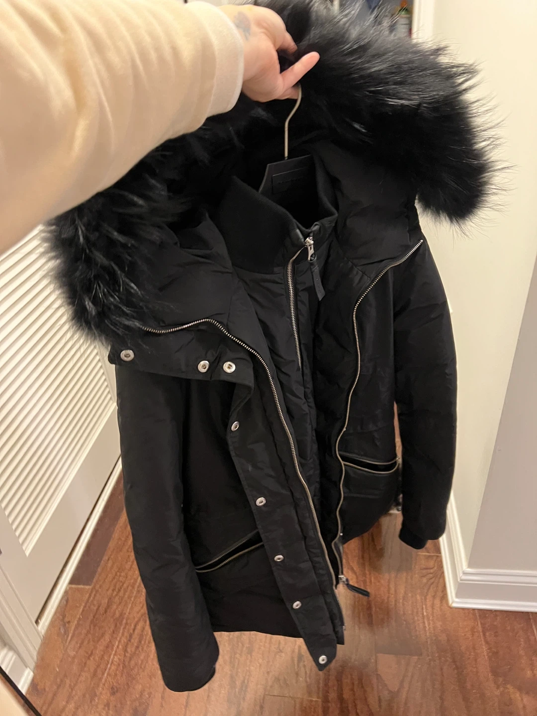 Selling a stylish black Mackage down winter coat. It features a fur-trimmed hood and a flattering silhouette, perfect for staying warm in the cold weather. In good condition and ready for a new owner!