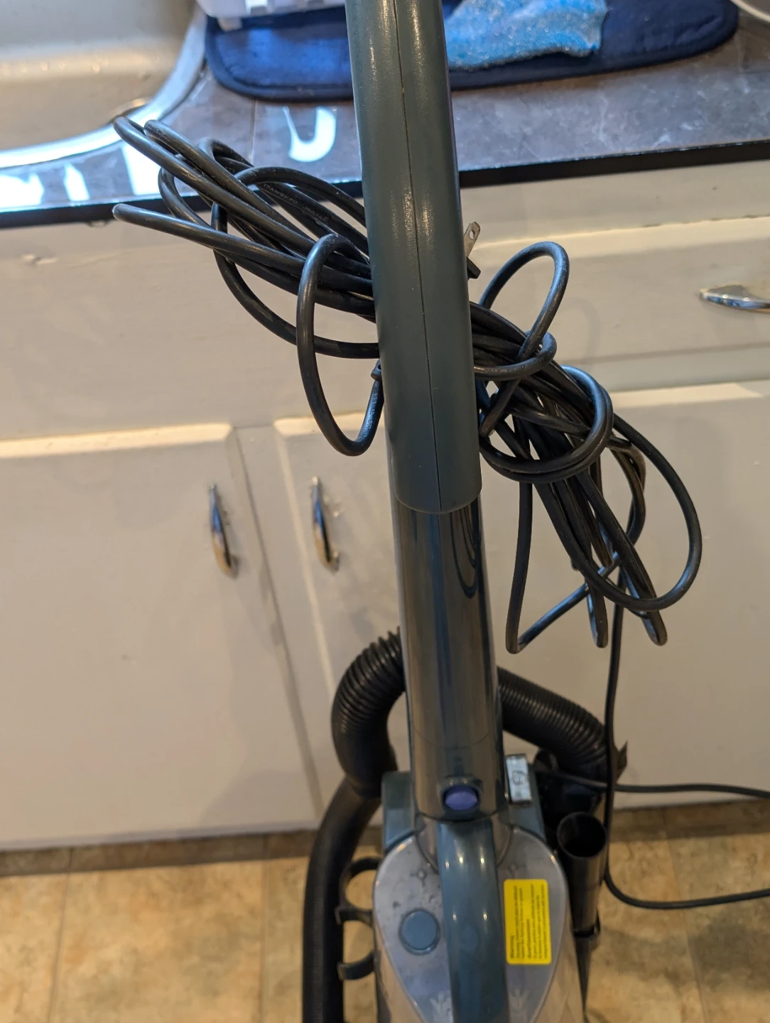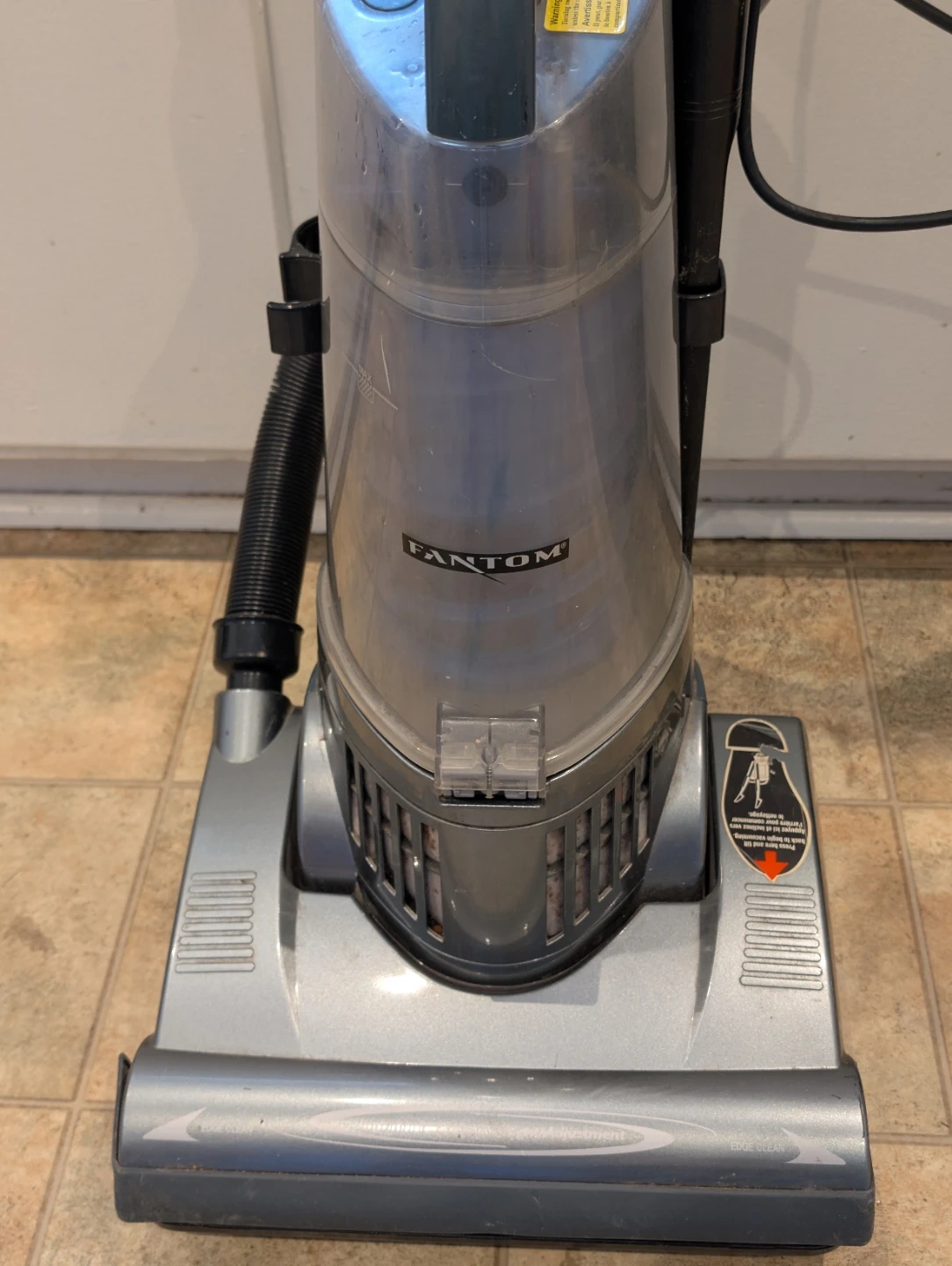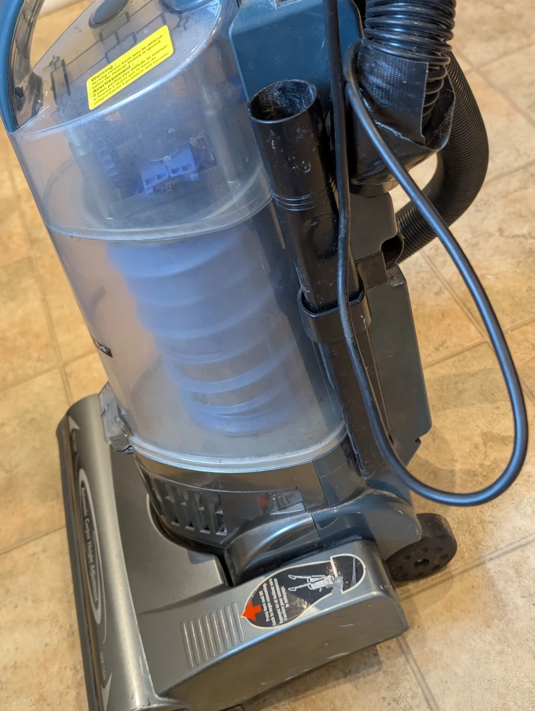 Upright vacuum cleaner with a bagless dustbin. It has a detachable hose and power cord. Works well for cleaning carpets and hard floors.
