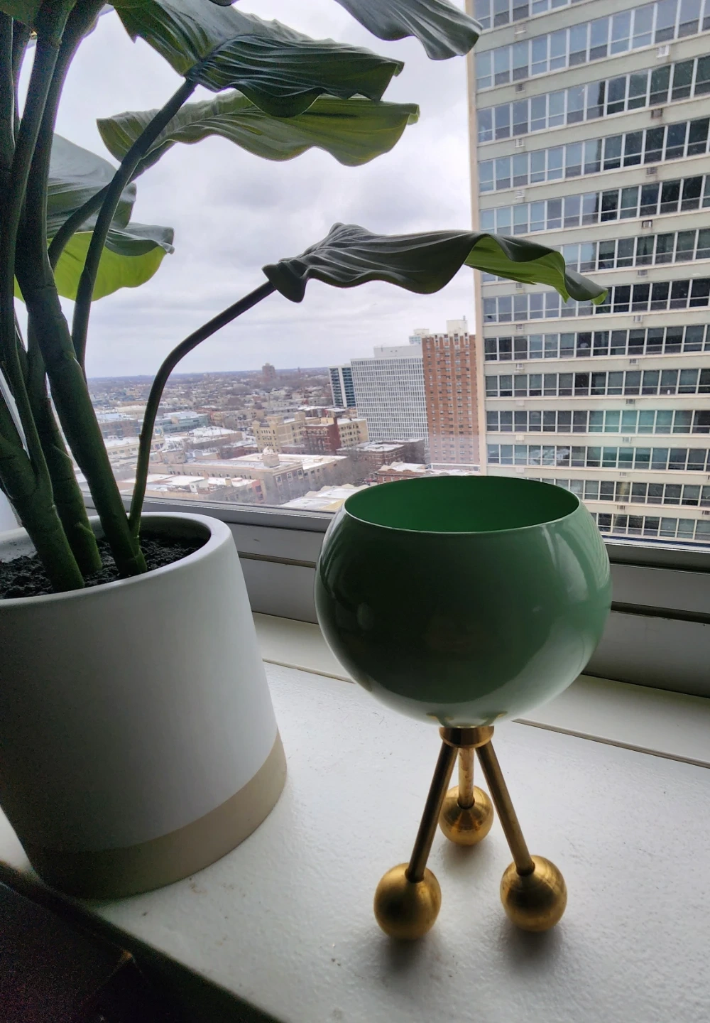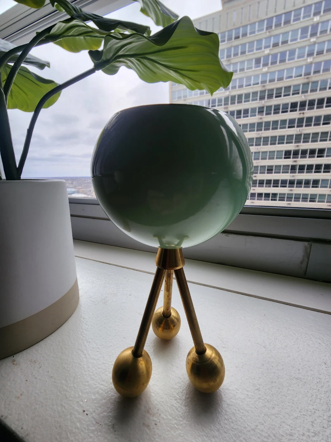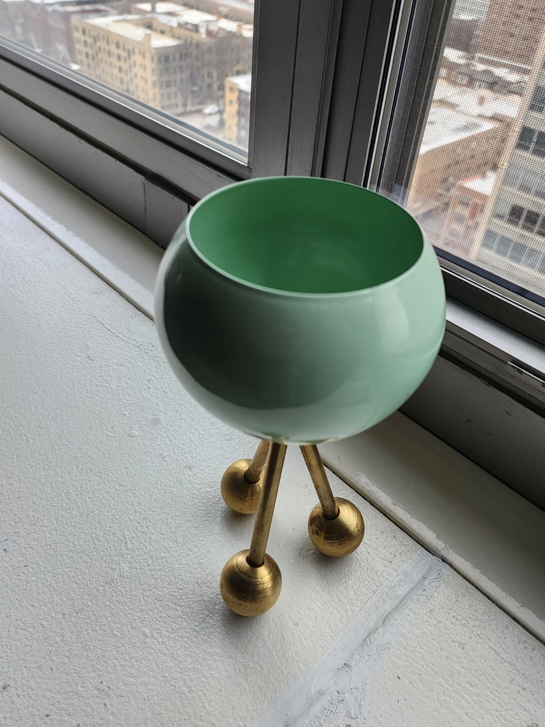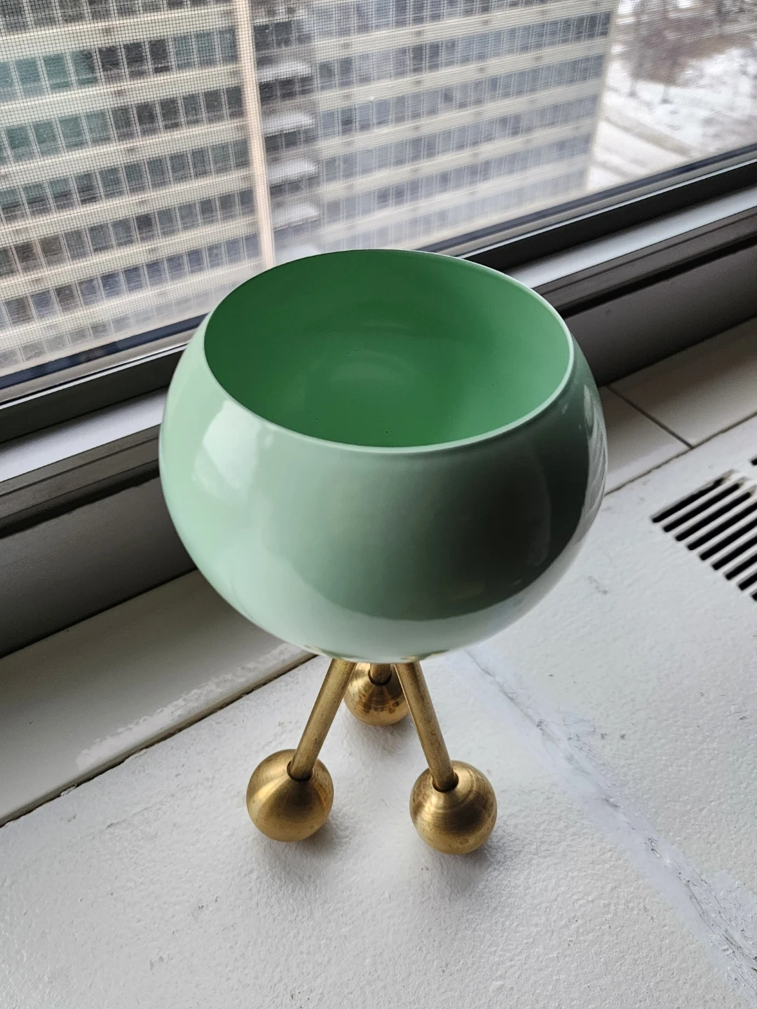 Here's a cute green globe planter with brass legs! It's perfect for adding a touch of mid-century modern style to your home or office