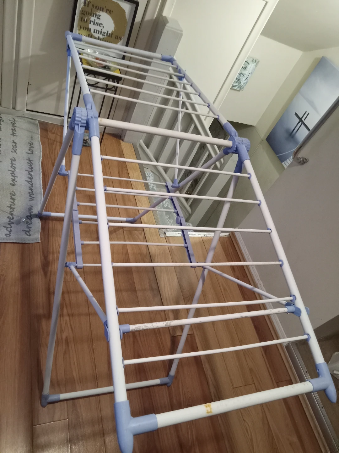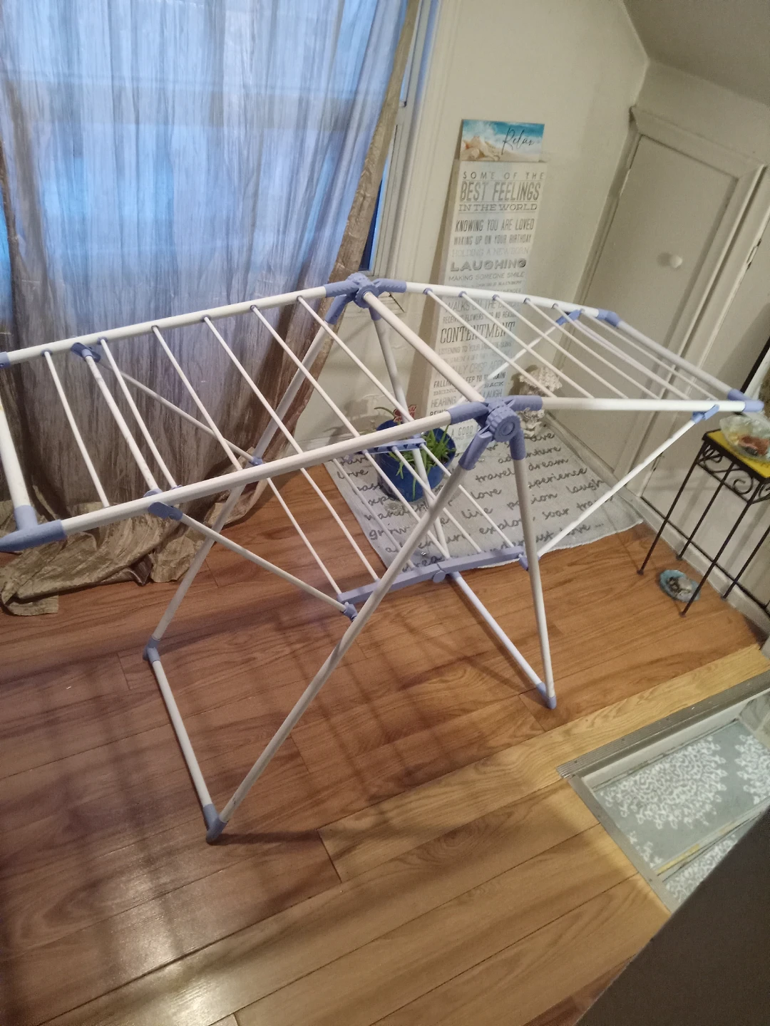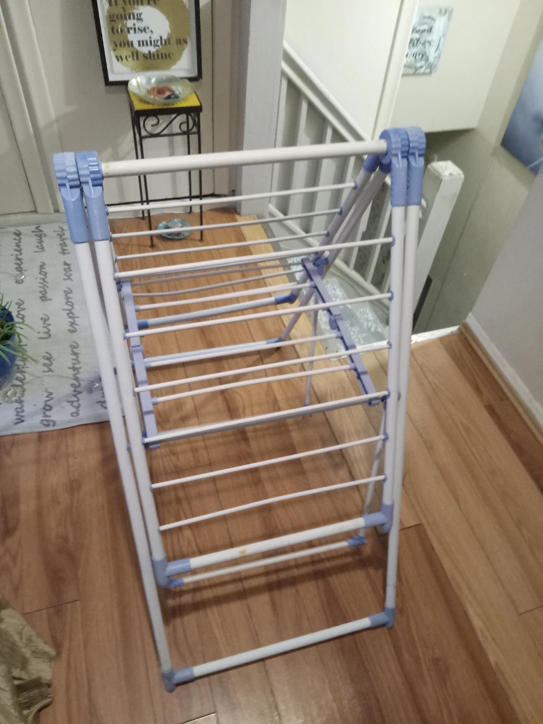 This is a white and blue collapsible drying rack. It's made of metal and plastic. It folds down for easy storage. When open, it offers ample space for drying clothes.
