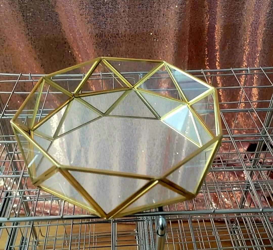 This geometric dish features gold-toned metal framing and clear glass panels. It's suitable for displaying small plants or decorative items. The open design makes it easy to access.