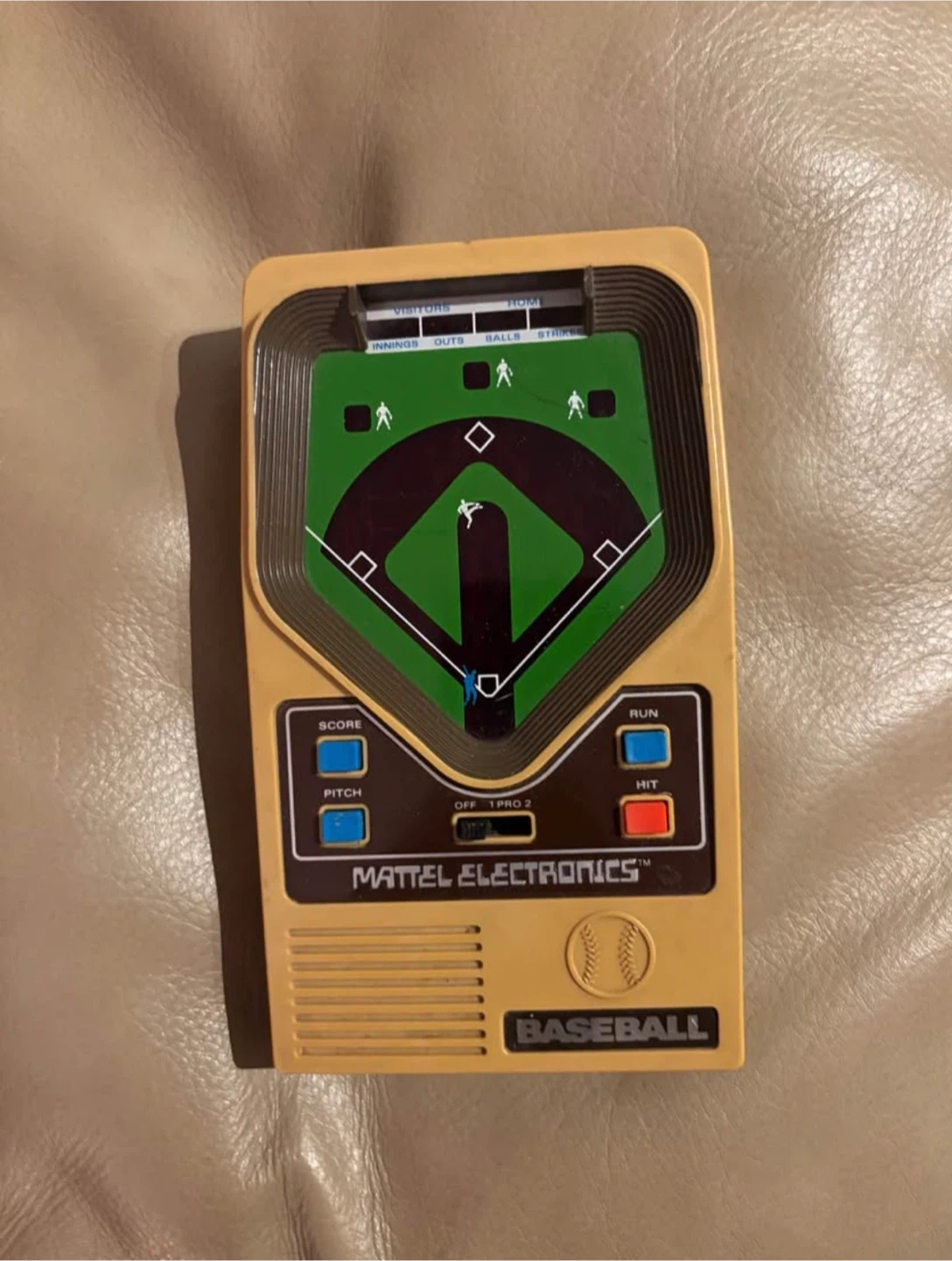 This is a Mattel Electronics handheld baseball game from the 1970s. It features two modes, 'OFF 1 PRO 2'. Get ready for some retro baseball fun!