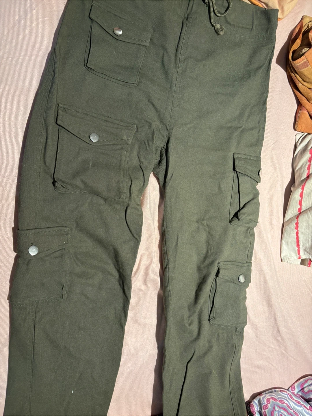 Selling a pair of olive green cargo pants. They have a drawstring and lots of pockets!