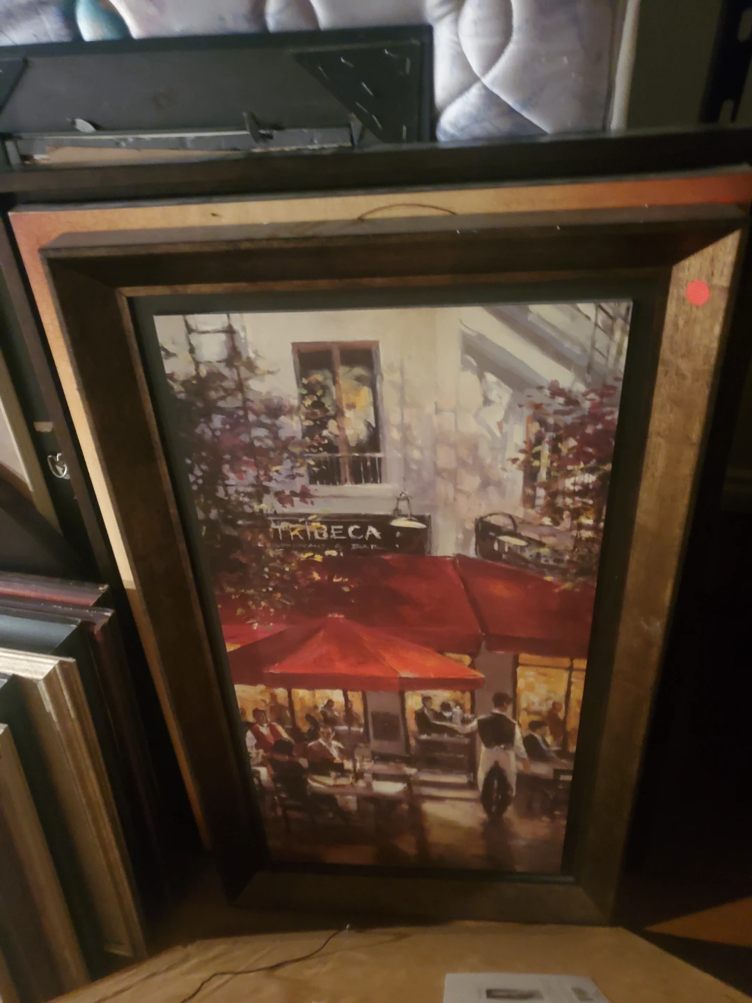 This framed print depicts a lively cafe scene in Tribeca with people dining under red umbrellas. The artwork is presented in a wooden frame. It's a nice piece to add to your home decor.