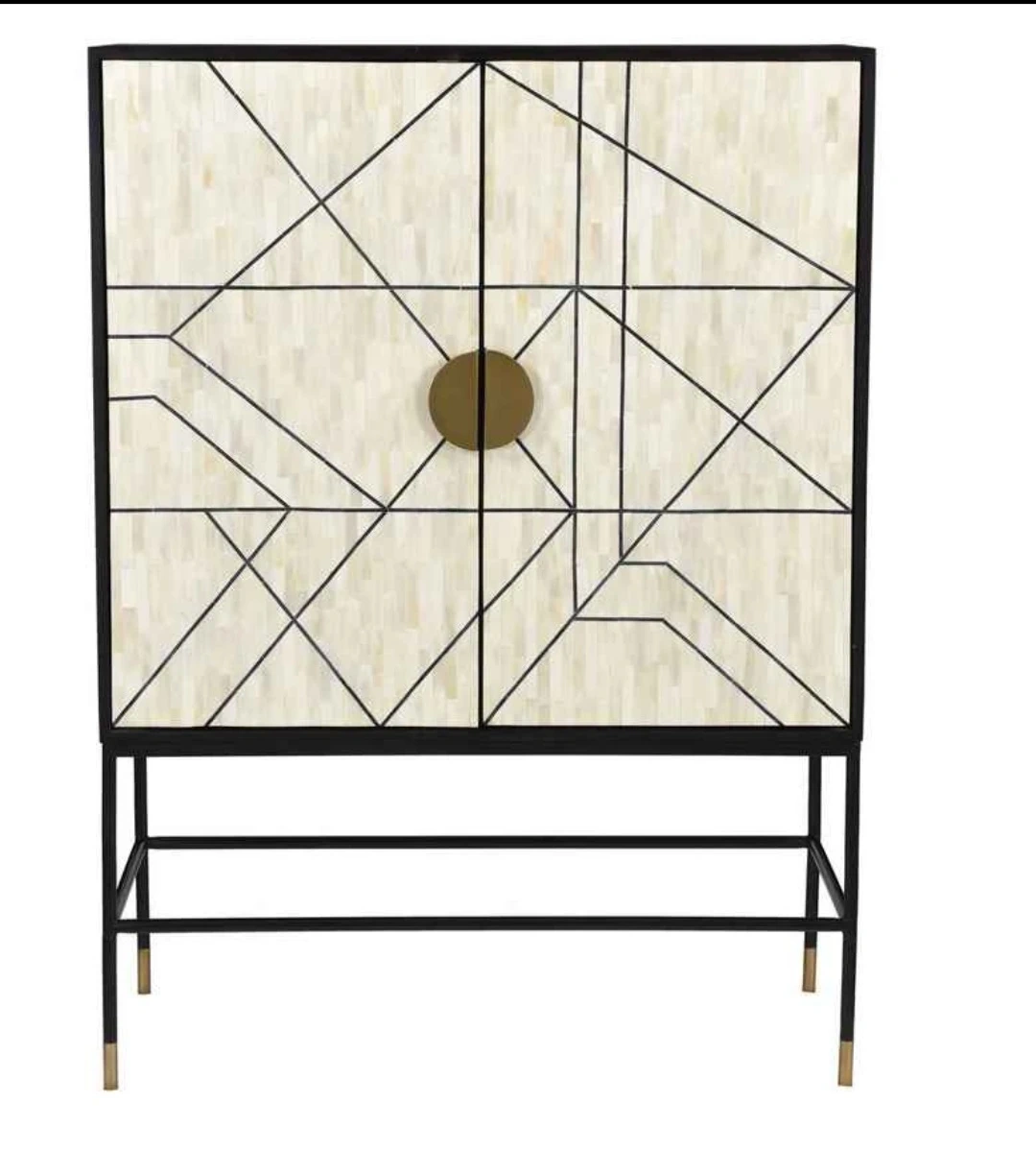 A striking bar cabinet featuring a geometric design inlaid with bone. It has a brass knob on the doors and stands on a black metal base. This piece offers stylish storage for your home. New in Box.