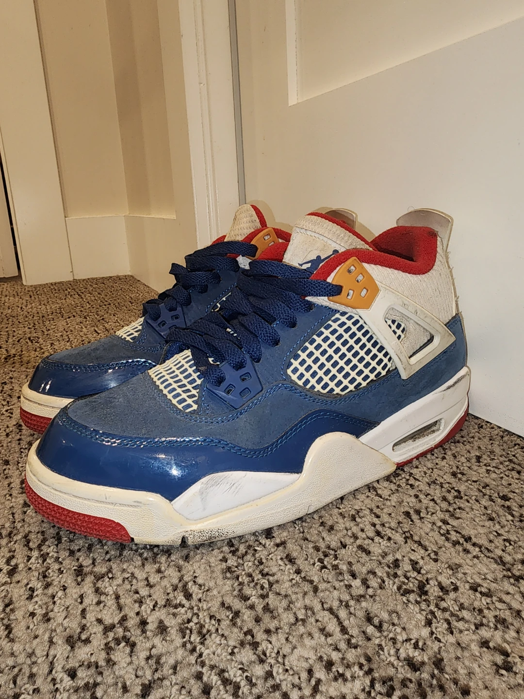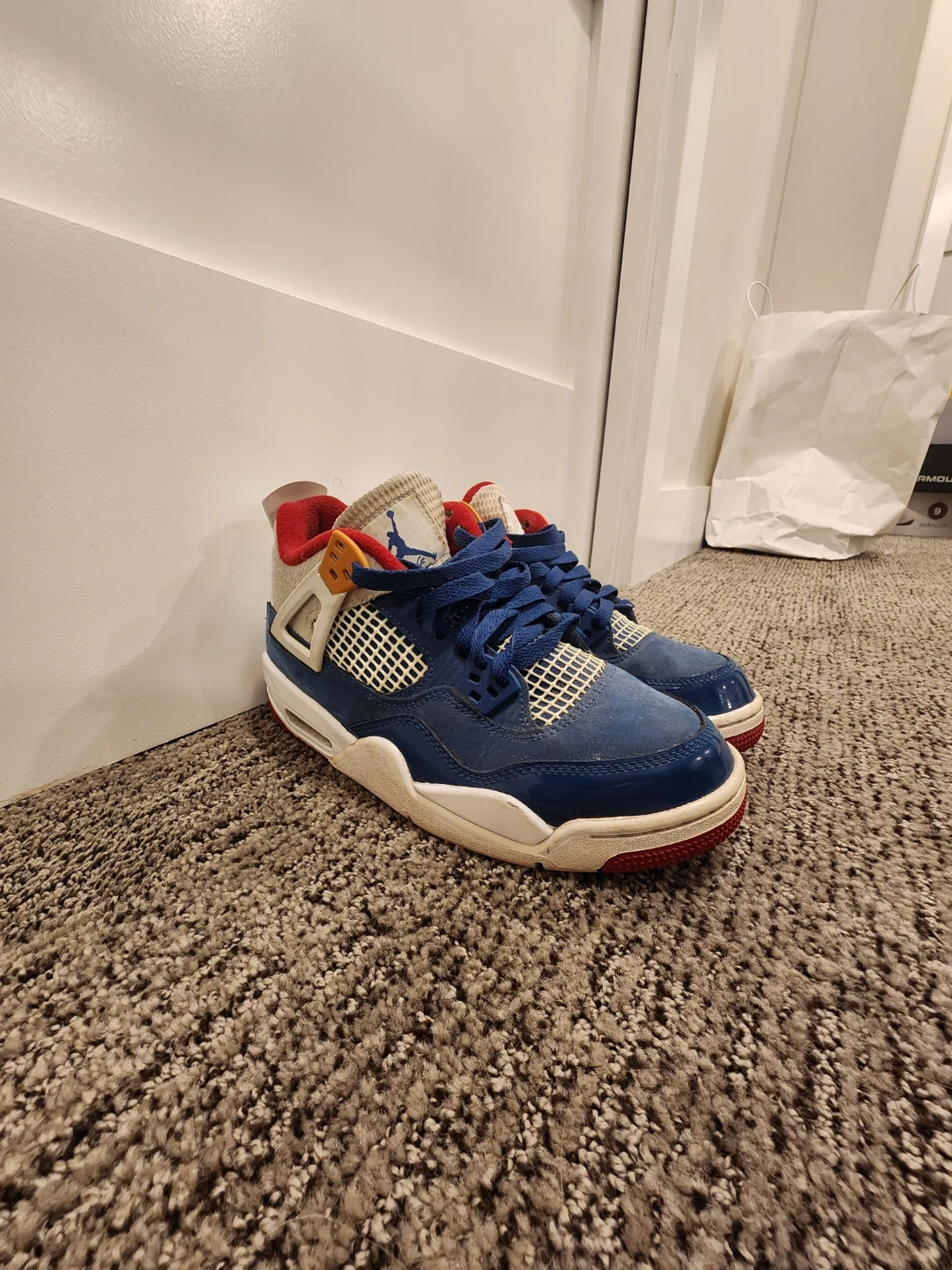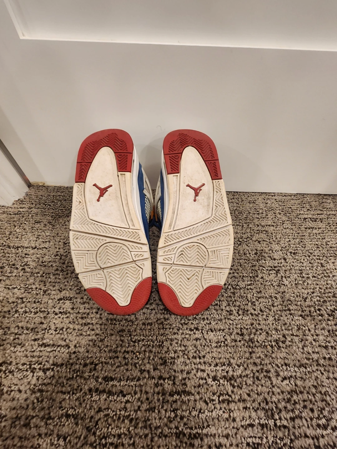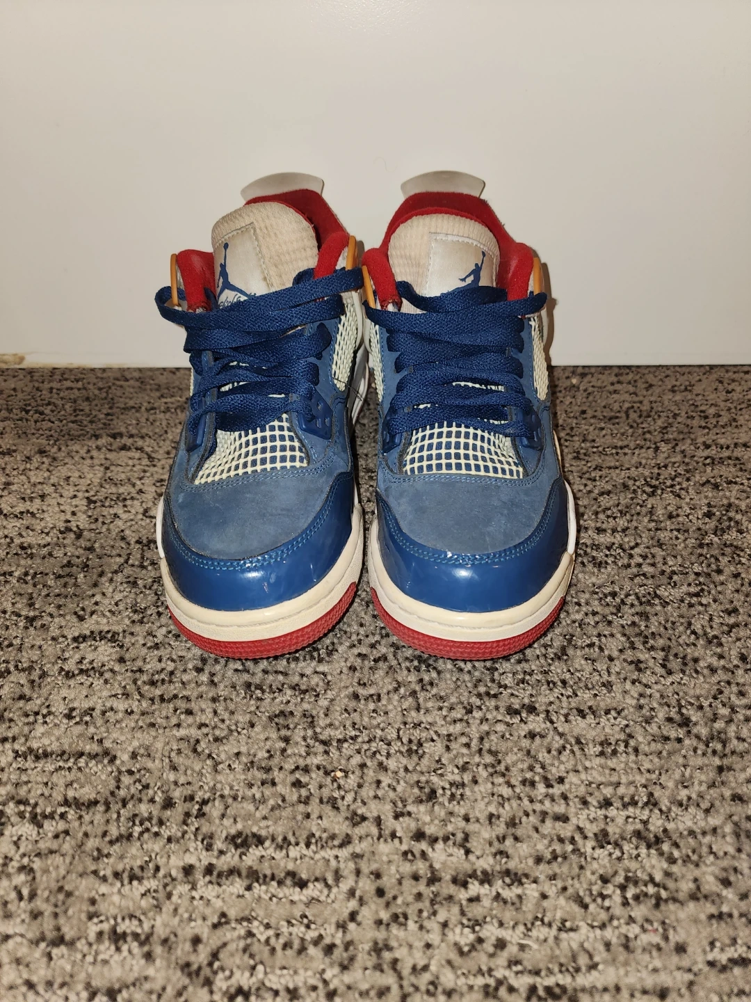 These toddler Jordan 4s are a cool blue colourway with red and white accents. They've got the iconic netting on the sides and a durable rubber sole. Perfect for little ones learning to walk or run! Size 6
