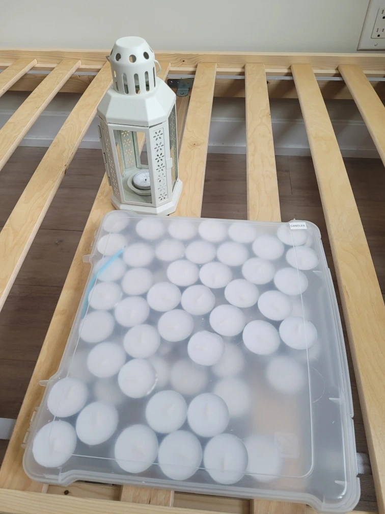 Here's a cute white candle lantern and a container of tea lights. The lantern would look great as a centrepiece or on a patio. The tea lights are perfect for creating a cozy atmosphere