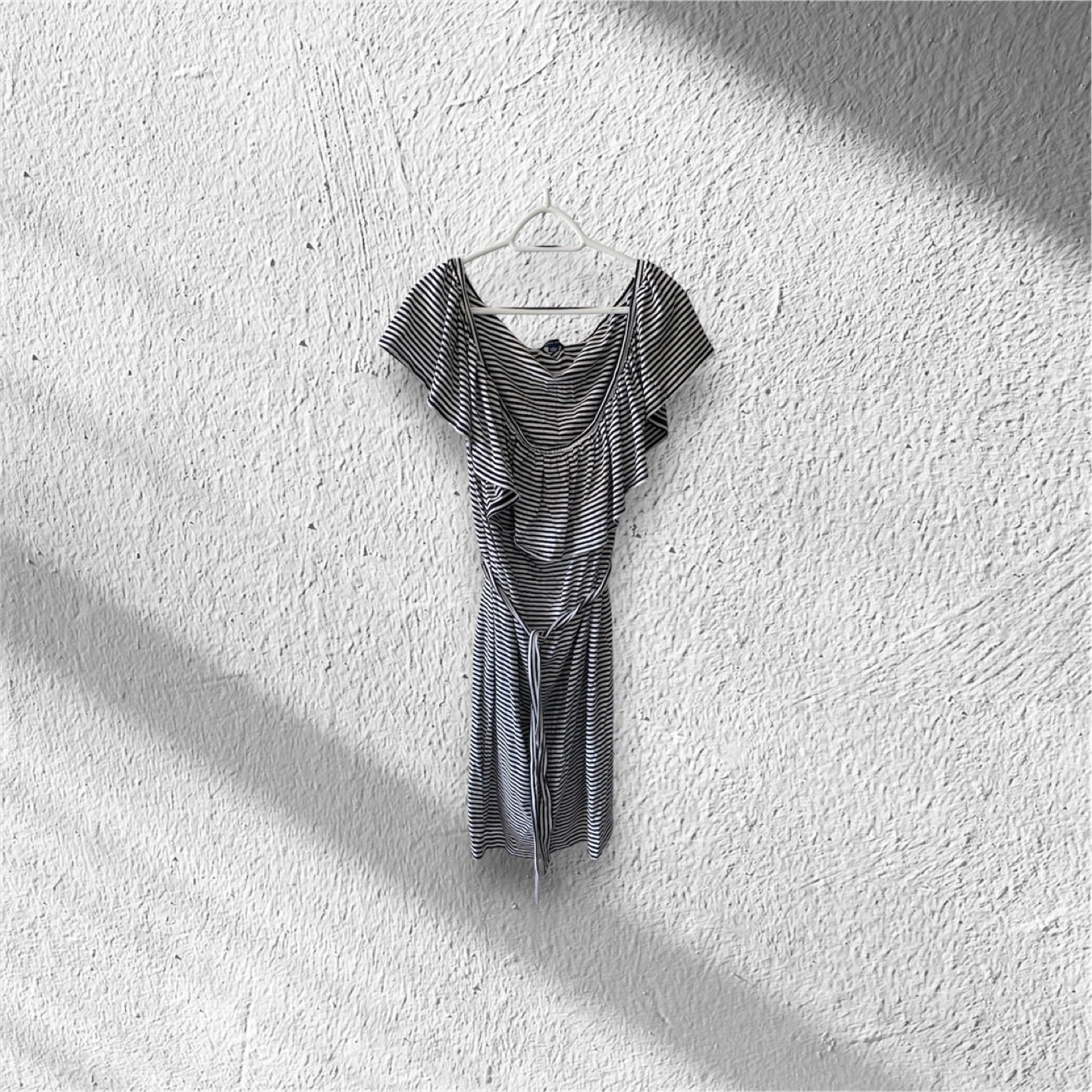 Striped off the shoulder dress with a tie waist. Short sleeves.