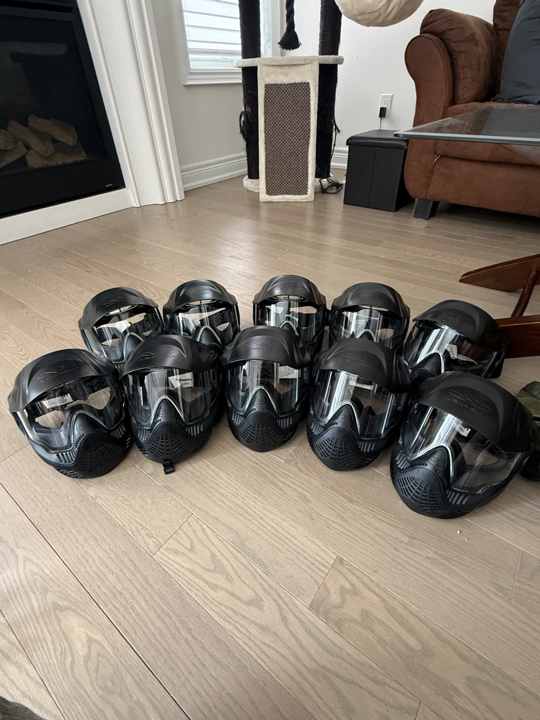 Set of 10 black Valken paintball masks. These masks offer full face protection with a clear, scratch-resistant lens. Adjustable strap for a secure fit. Great for group outings!